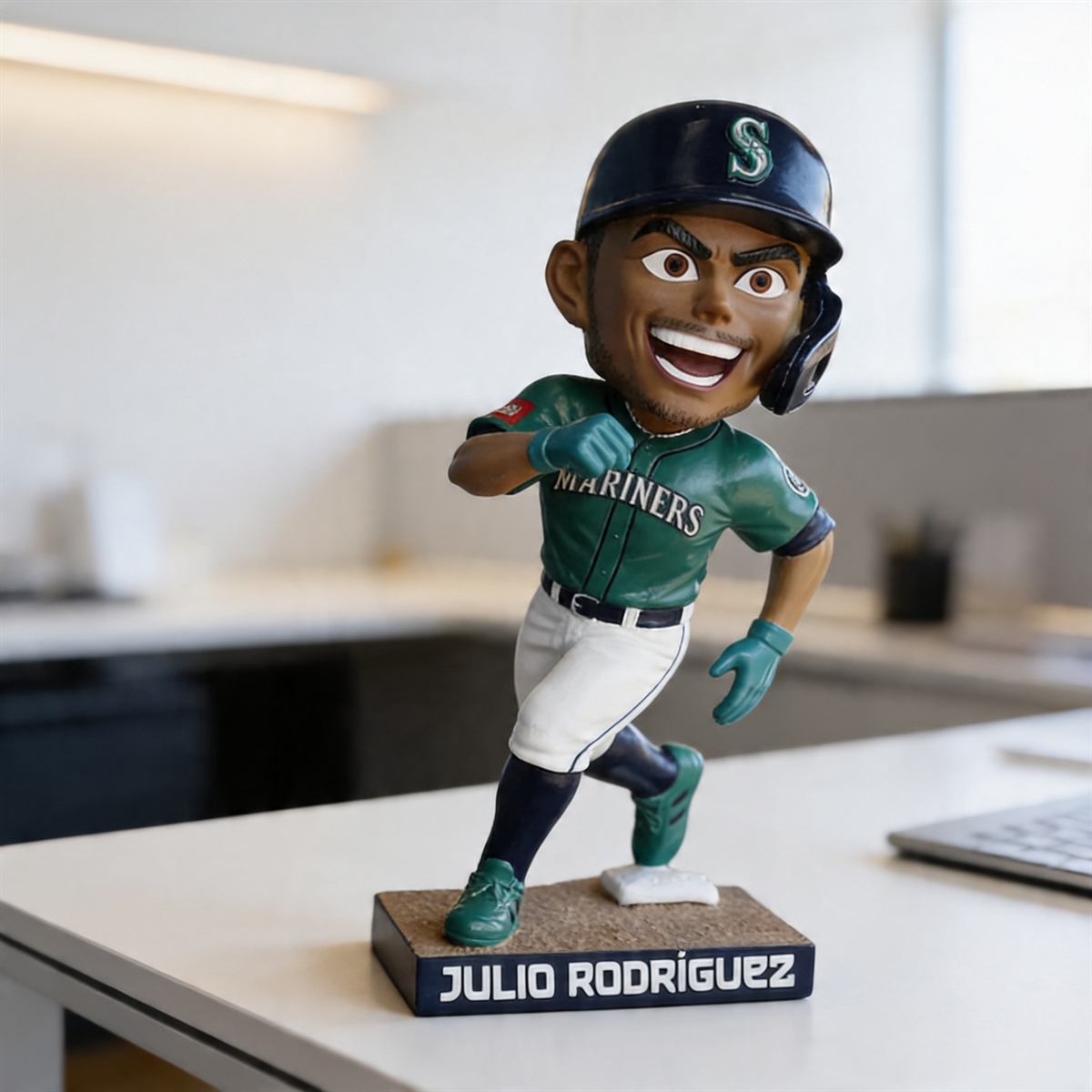 The bobblehead is a groundbreaking piece of sports memorabilia that reimagines the franchise’s franchise centerfielder in a distinct, animated art style. The figure portrays Julio Rodríguez in his classic teal alternate uniform, mid-stride in an energetic running pose. Featuring oversized, expressive eyes and a wide, heroic smile characteristic of classic animation protagonists, the design leaps away from traditional photorealism. Standing atop a stylized base featuring his name, this stadium giveaway captures the sheer joy and kinetic energy that Julio brings to the diamond every single game.
