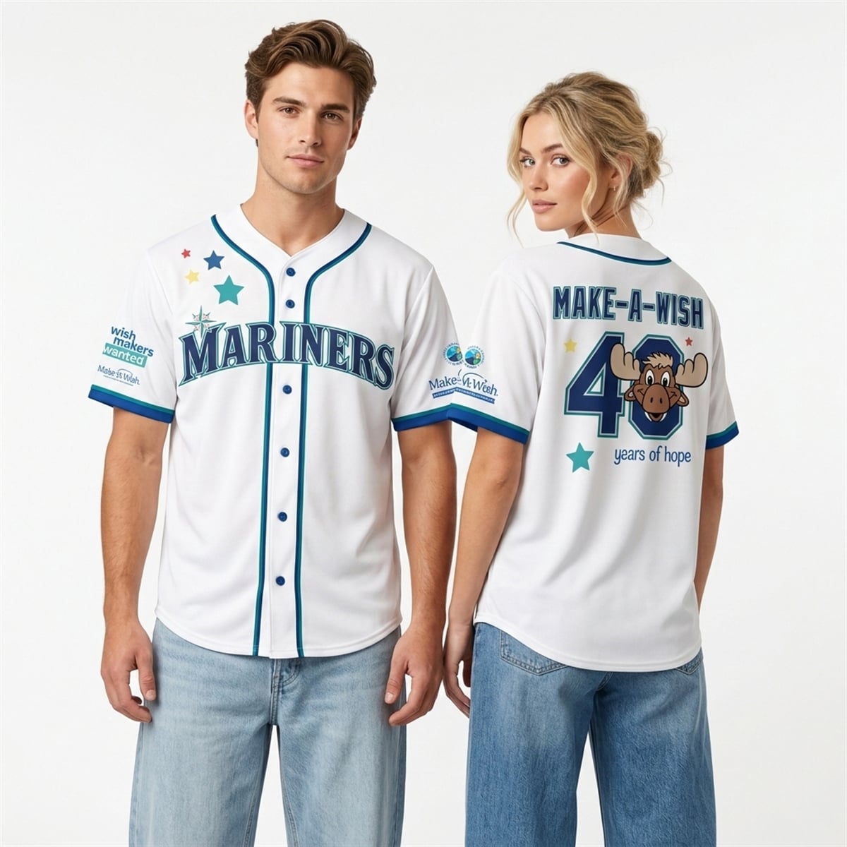 What sets this item apart are the vibrant, multi-colored stars cascading down the right shoulder, adding a whimsical and uplifting aesthetic. The sleeves feature exclusive patch designs, including the “wish makers wanted” campaign slogan and the Make-A-Wish logo. On the reverse side, the jersey proudly displays “MAKE-A-WISH” as the nameplate, resting above a large number “40.” The iconic Mariner Moose mascot is playfully integrated into the zero of the number, anchored by the inspiring phrase “years of hope” and additional colorful stars.