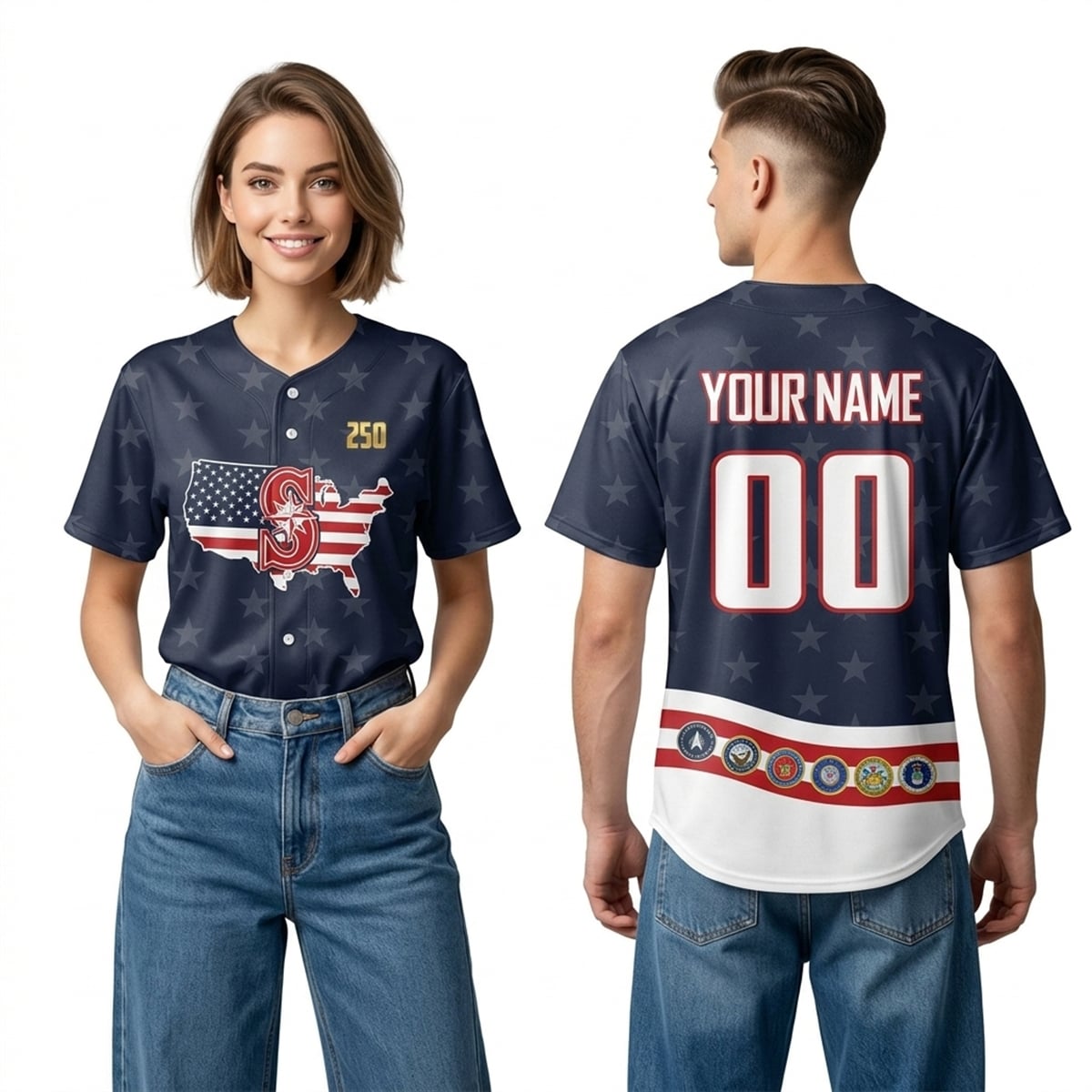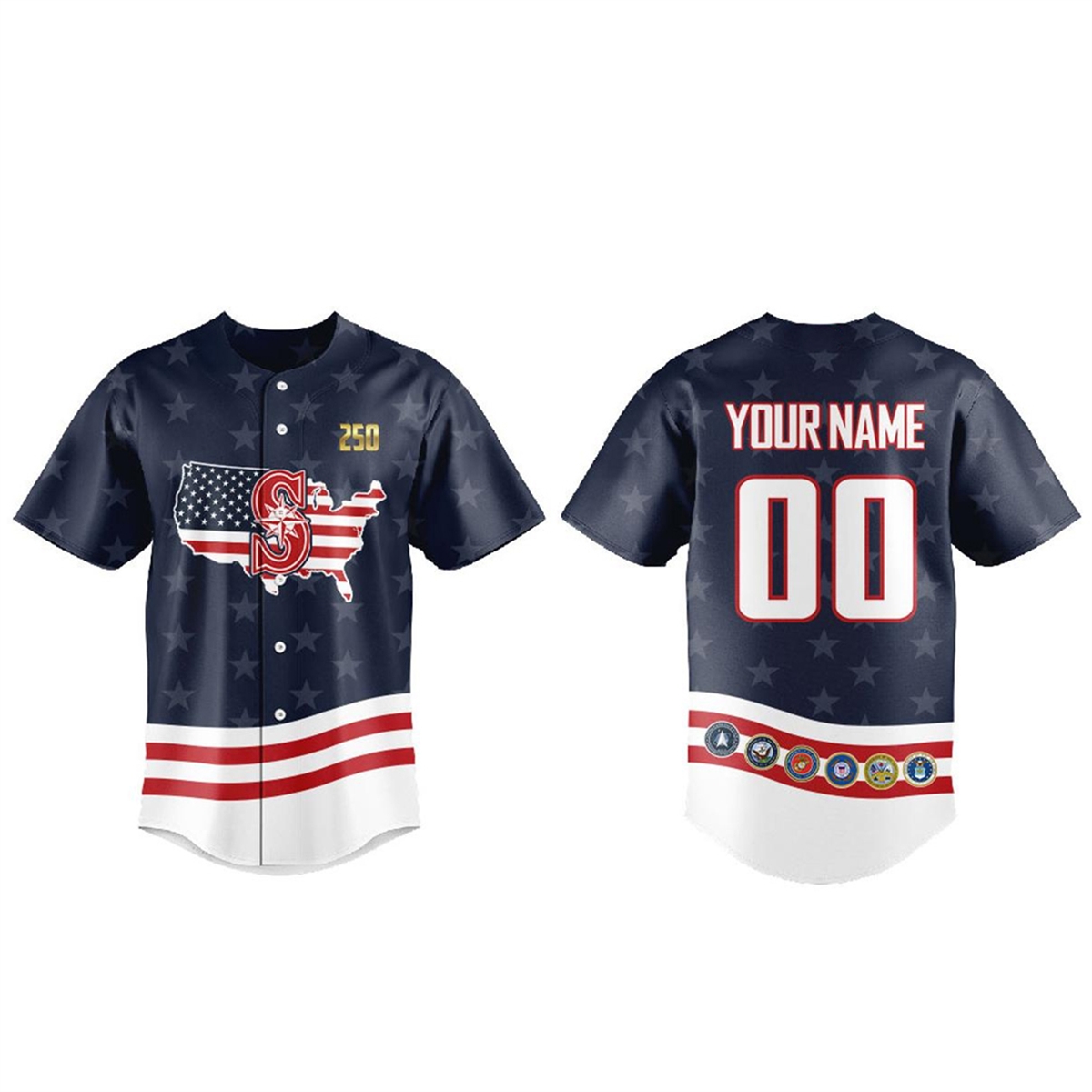 Every visual element on this jersey carries intentional significance. The integration of the American flag within the map of the United States symbolizes a unified nation, while the overlay of the Mariners’ compass represents the Pacific Northwest’s specific connection to that national identity. The gold “250” is a direct nod to the year 2026, marking 250 years since the signing of the Declaration of Independence. Finally, the placement of the six military seals along the foundation of the jersey’s back serves as a visual metaphor: the freedom to enjoy America’s pastime is supported and protected by the combined strength of these armed forces.