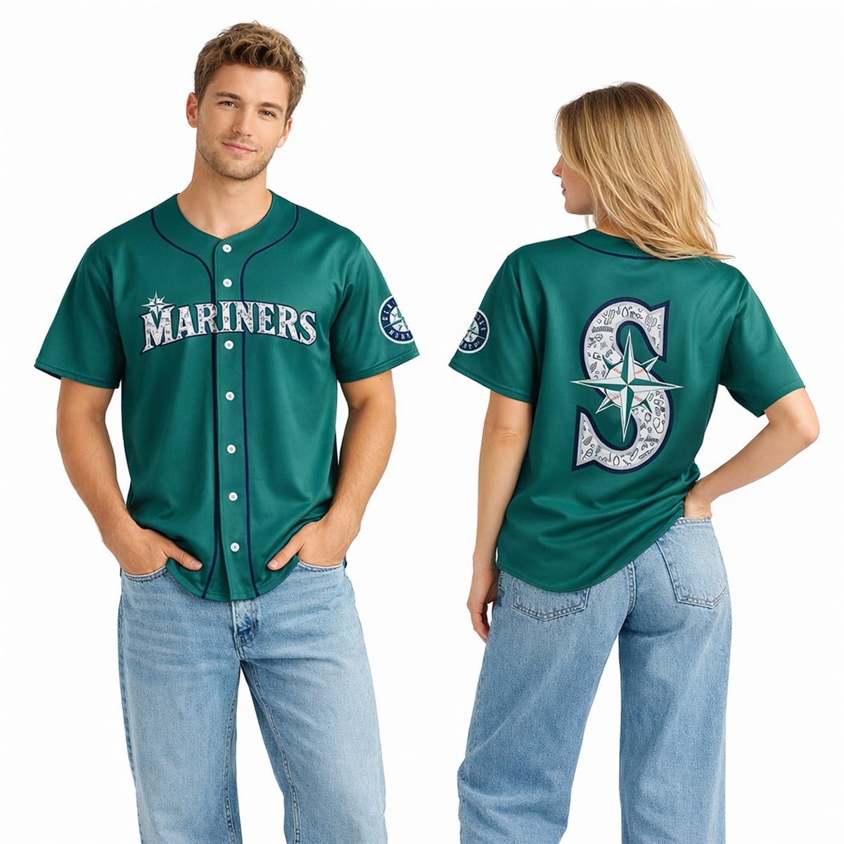 The jersey is a visually striking commemorative piece designed to celebrate the medical community. The garment features the Mariners’ vibrant, signature Northwest Green color as its base. Across the chest, the classic “Mariners” wordmark is reimagined with a custom, intricate pattern. The back of the jersey showcases the iconic Mariners “S” and compass rose logo on a grand scale. Look closely at the white space within both the front lettering and the back logo, and you will find a beautifully detailed mosaic of healthcare iconography, seamlessly blending sports branding with nursing imagery.