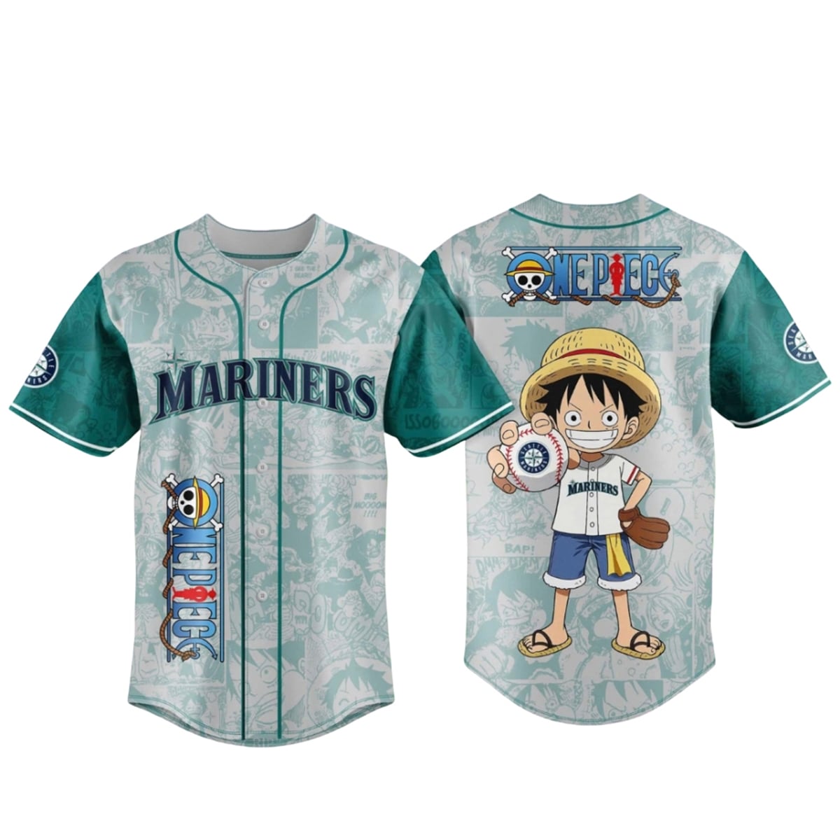 The jersey is a visual masterpiece that celebrates two legendary franchises. The design features a stunning all-over print consisting of classic manga panels in a subtle, monochromatic teal wash, perfectly aligned with the Mariners’ iconic color palette. On the front, the traditional “MARINERS” wordmark arches proudly across the chest, anchored by a customized One Piece logo running vertically down the side, where the classic Jolly Roger skull is seamlessly integrated with the Mariners’ compass rose.