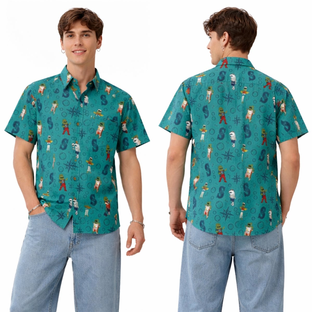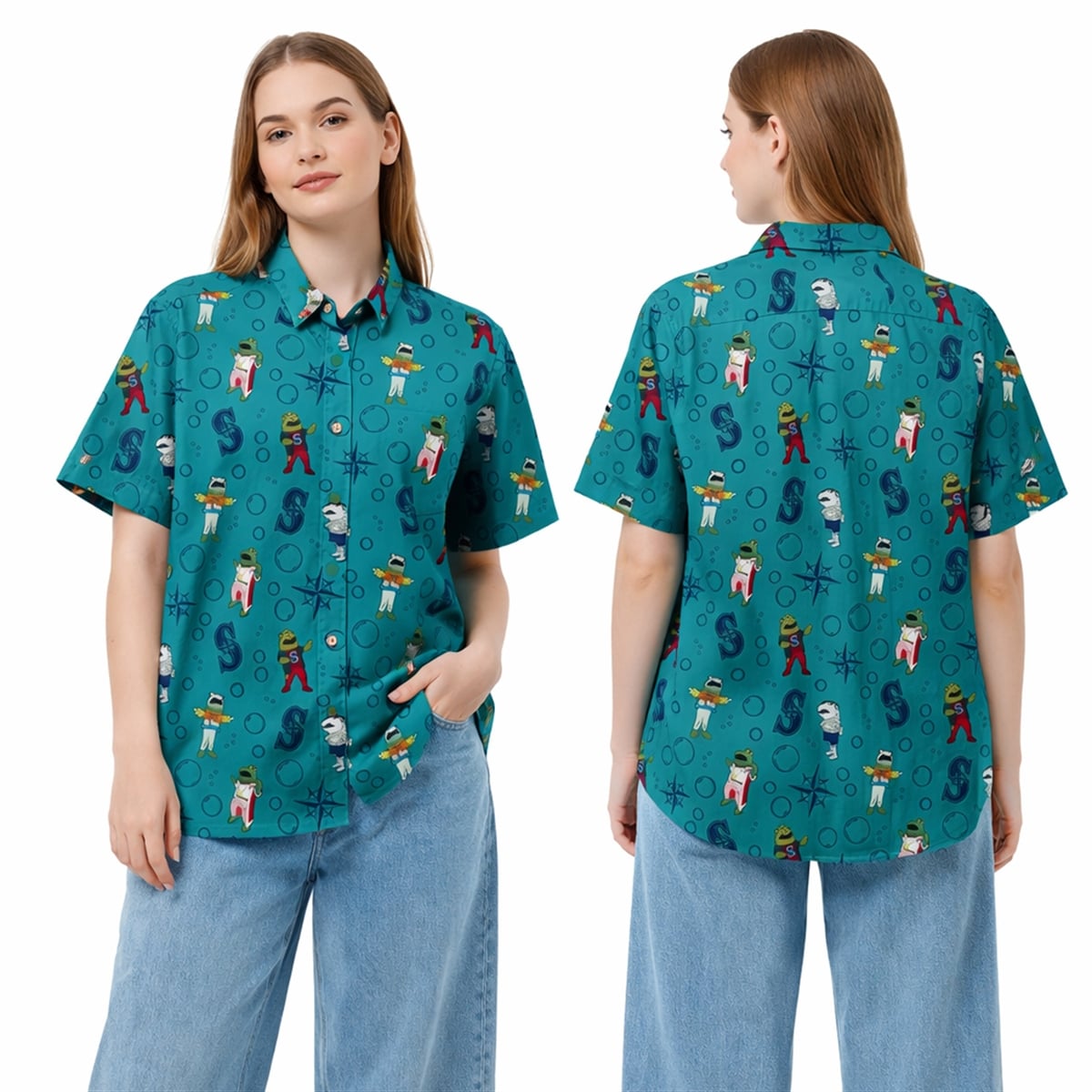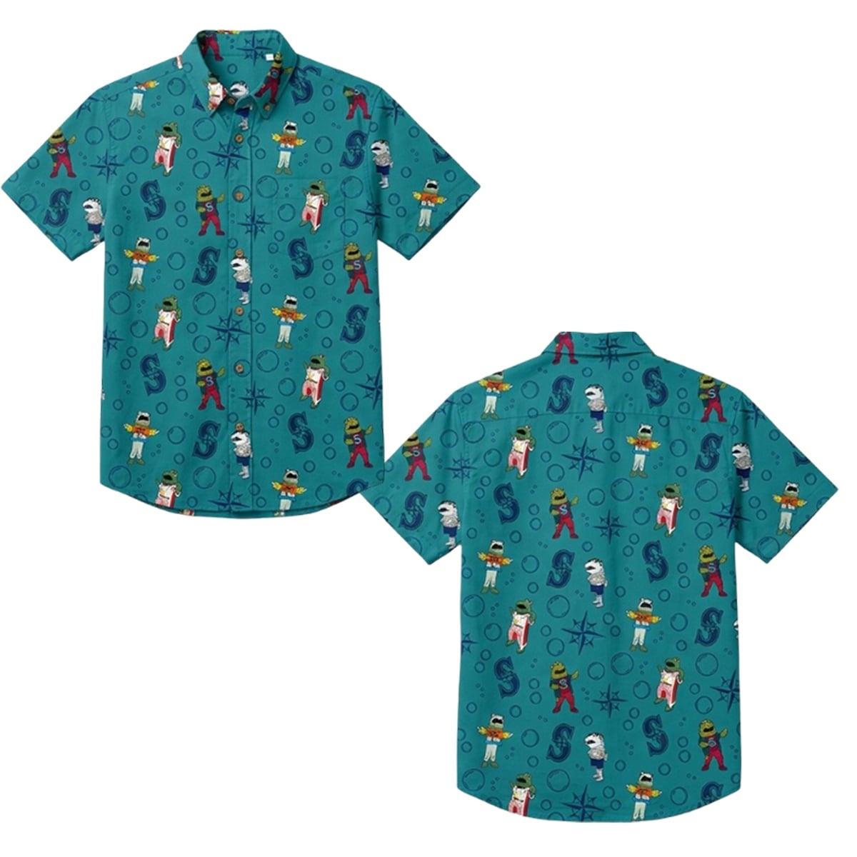 The shirt is a masterclass in sports-themed visual storytelling. Set against a deep, aquatic teal background, the design is heavily populated with maritime imagery that pays homage to the coastal identity of the Pacific Northwest. Scattered throughout the pattern are whimsical bubbles, classic nautical compasses, and the iconic Seattle Mariners “S” compass logo. Accompanying these symbols are playful, mascot-inspired characters outfitted in various Mariners uniforms, seemingly floating and swimming through an underwater wonderland. This combination of team branding with a fun, aquatic theme creates a visually engaging aesthetic that stands out brilliantly in any crowd.