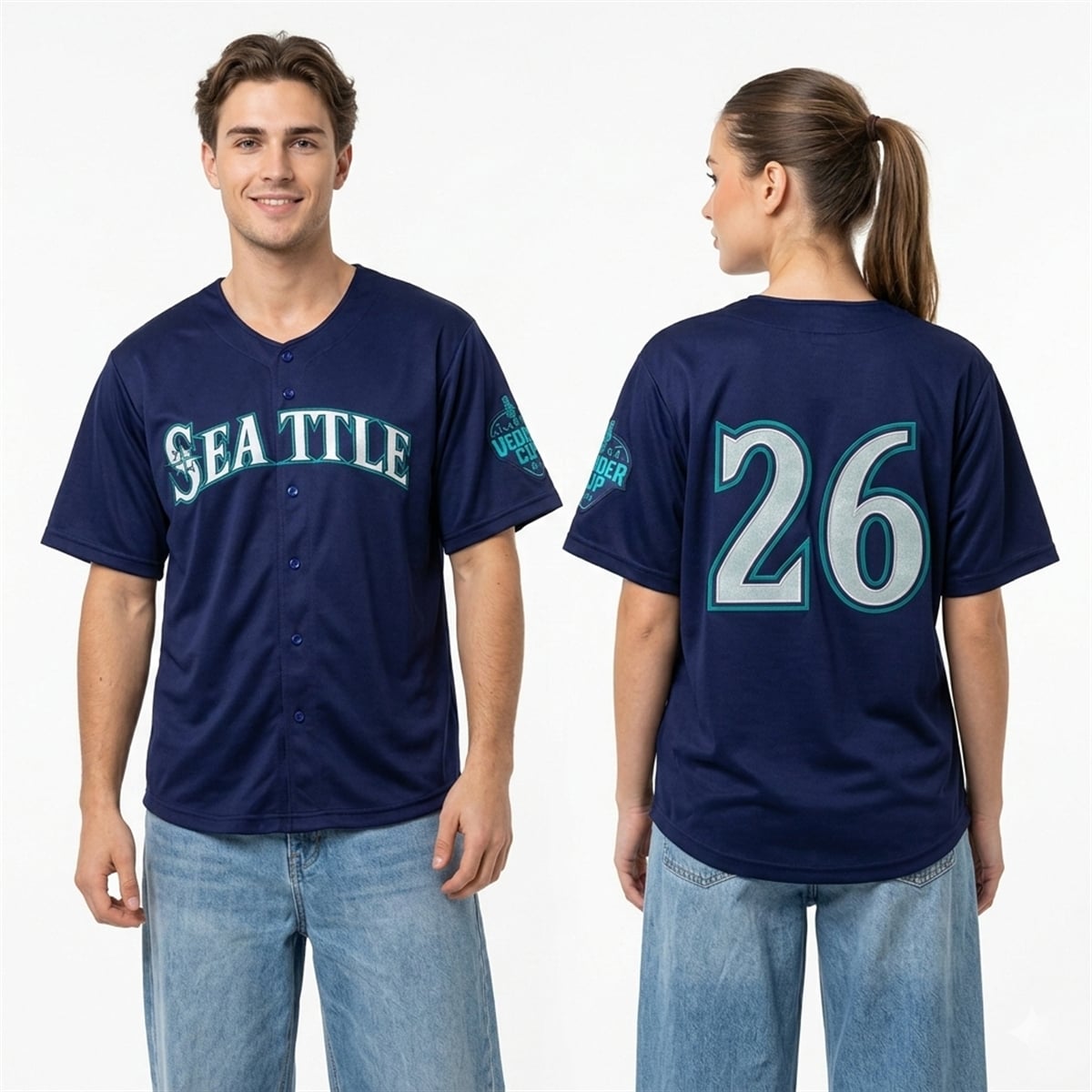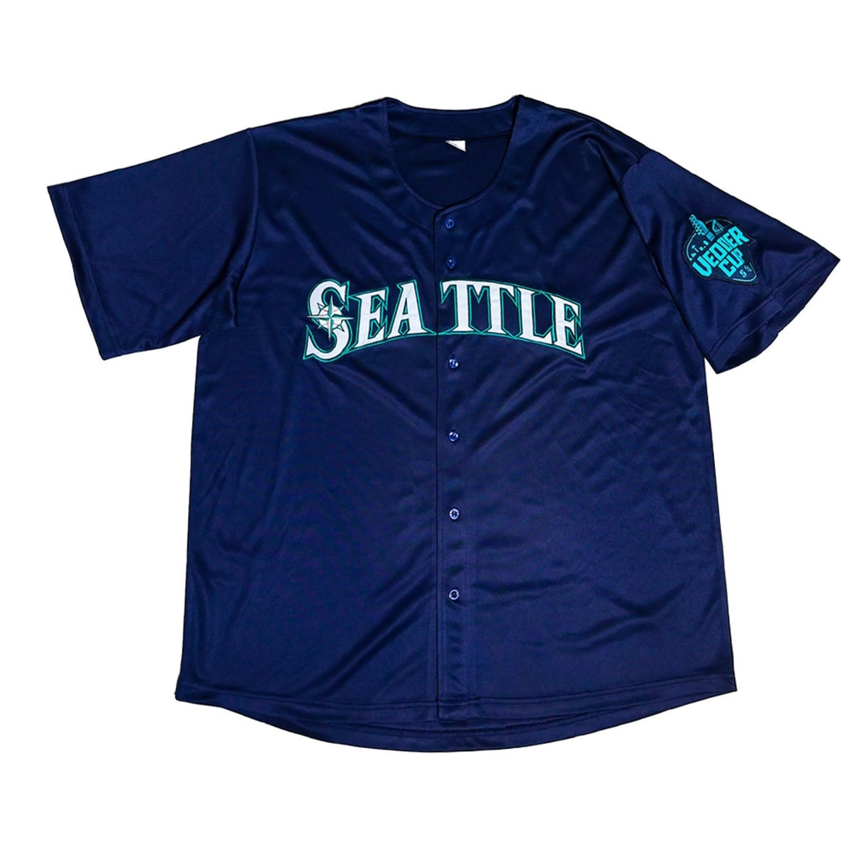 The jersey is a stunning visual tribute to Seattle baseball. Featuring a deep, classic navy blue base, the front displays the bold “SEATTLE” lettering spanning the chest, complete with the iconic compass rose logo embedded in the “S“. The striking contrast of the team’s signature Northwest Green and metallic silver outlines makes the graphics pop beautifully against the dark background. The true centerpiece, however, is the teal and navy “Vedder Cup” commemorative patch proudly displayed on the left sleeve. This distinct emblem transforms an everyday piece of fan gear into a specific, time-stamped piece of Mariners history.