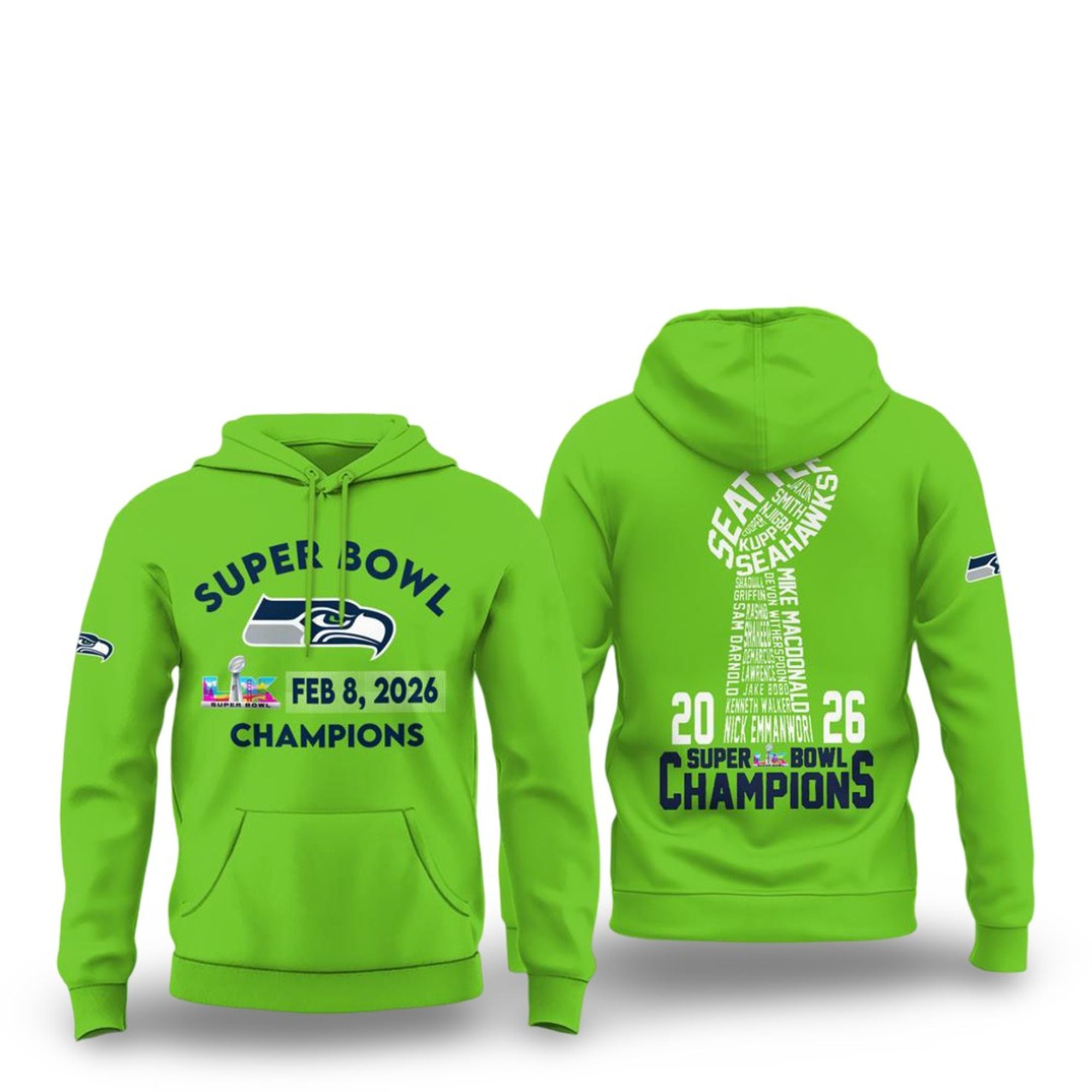 On February 8, 2026, the Seattle Seahawks cemented their legacy by conquering Super Bowl LX, marking a defining moment in the franchise’s new era. This 2026 Seattle Seahawks Super Bowl LX Champions Hoodie serves as the ultimate wearable timeline of that victory. Designed for the devoted “12s” who stood by the team through every down, this piece captures the euphoria of the final whistle.
