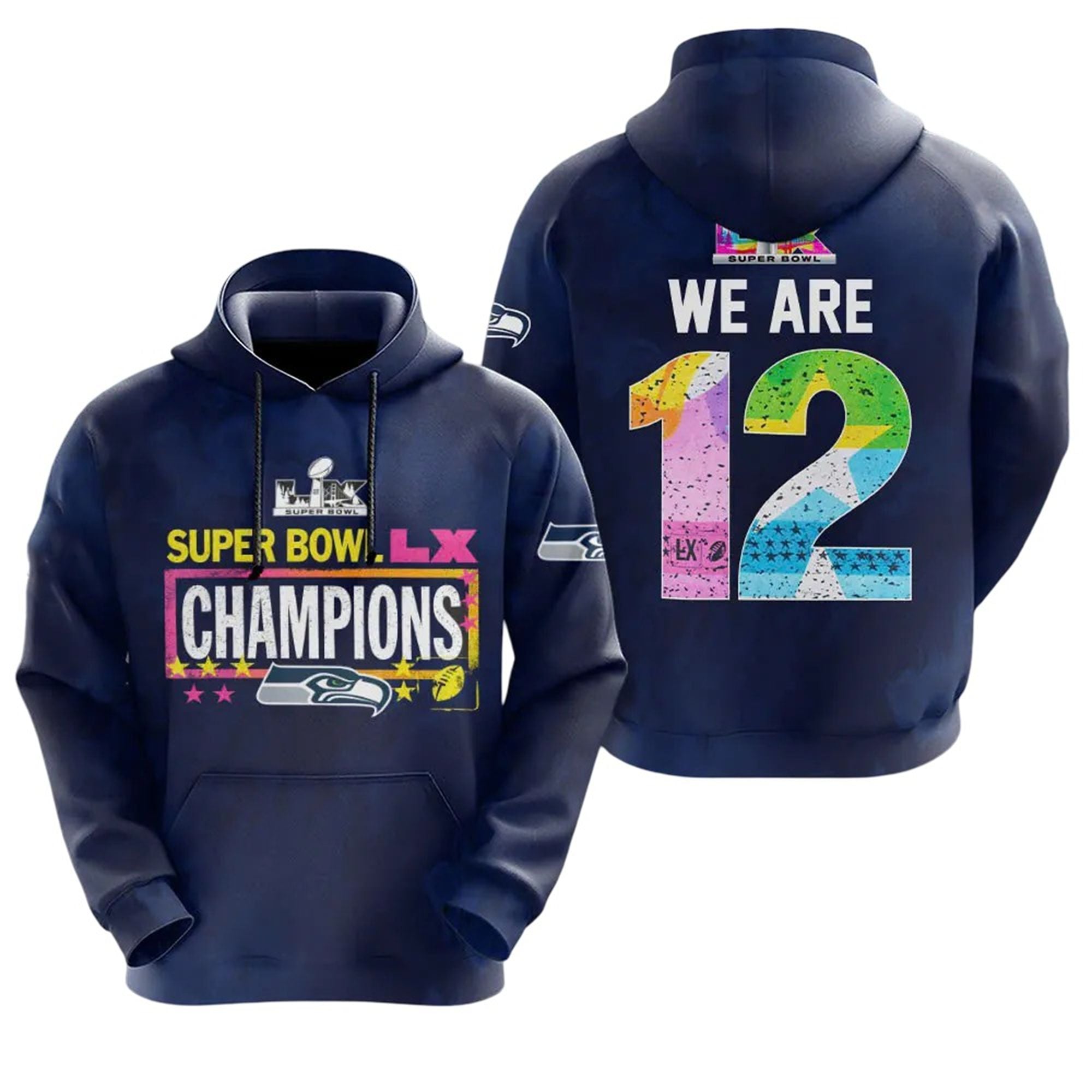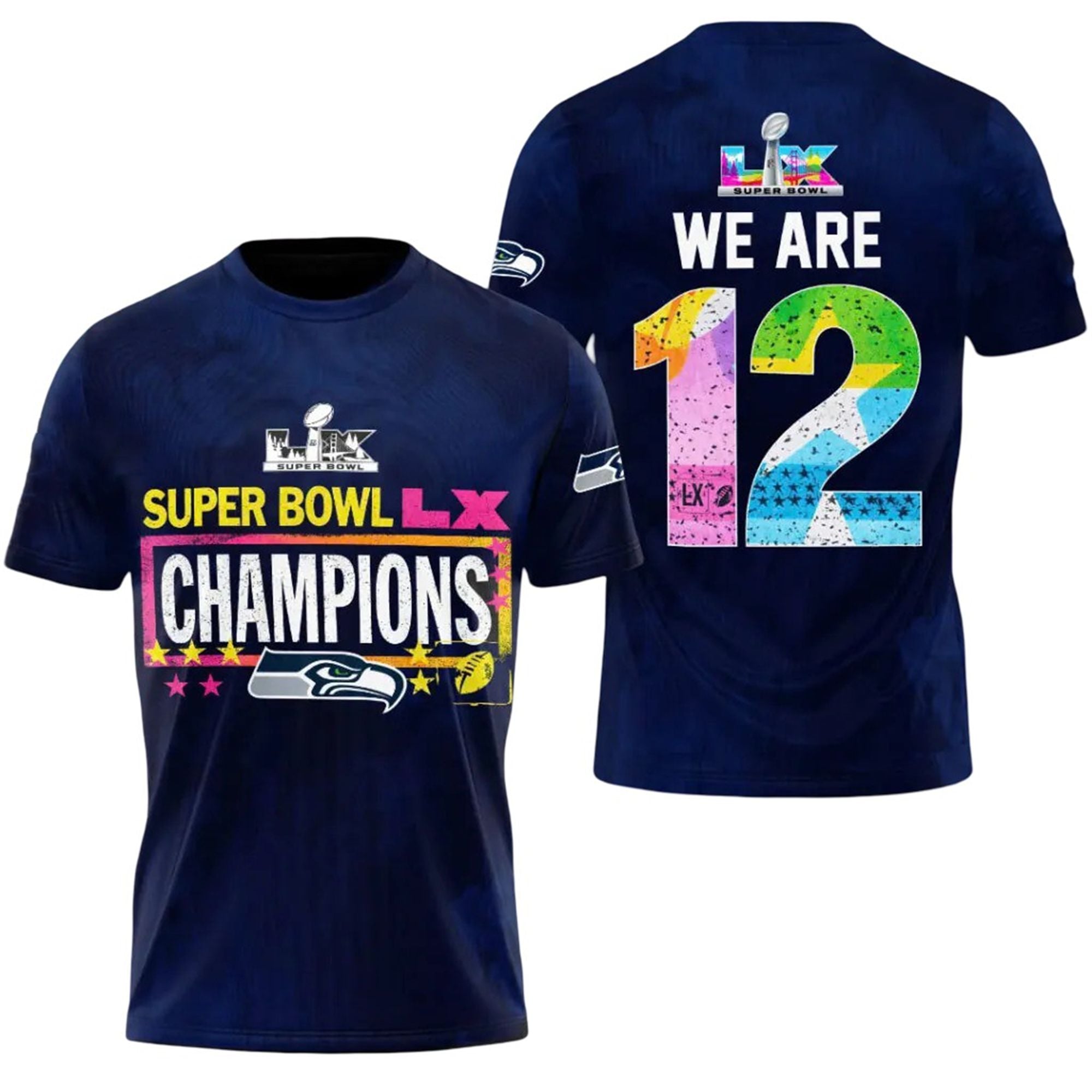 On the back, the message is loud and clear: “WE ARE 12.” The oversized number 12 is artistically filled with a dynamic splash of colors, symbols, and stars, representing the diversity and unity of the Seahawks’ faithful. Whether you were cheering from the rainy streets of Seattle or the sunny stands in California, this shirt unites every fan under one banner. It is the perfect keepsake to wear to the victory parade, draft parties, or casual Fridays to remind rivals who reigns supreme in the football.