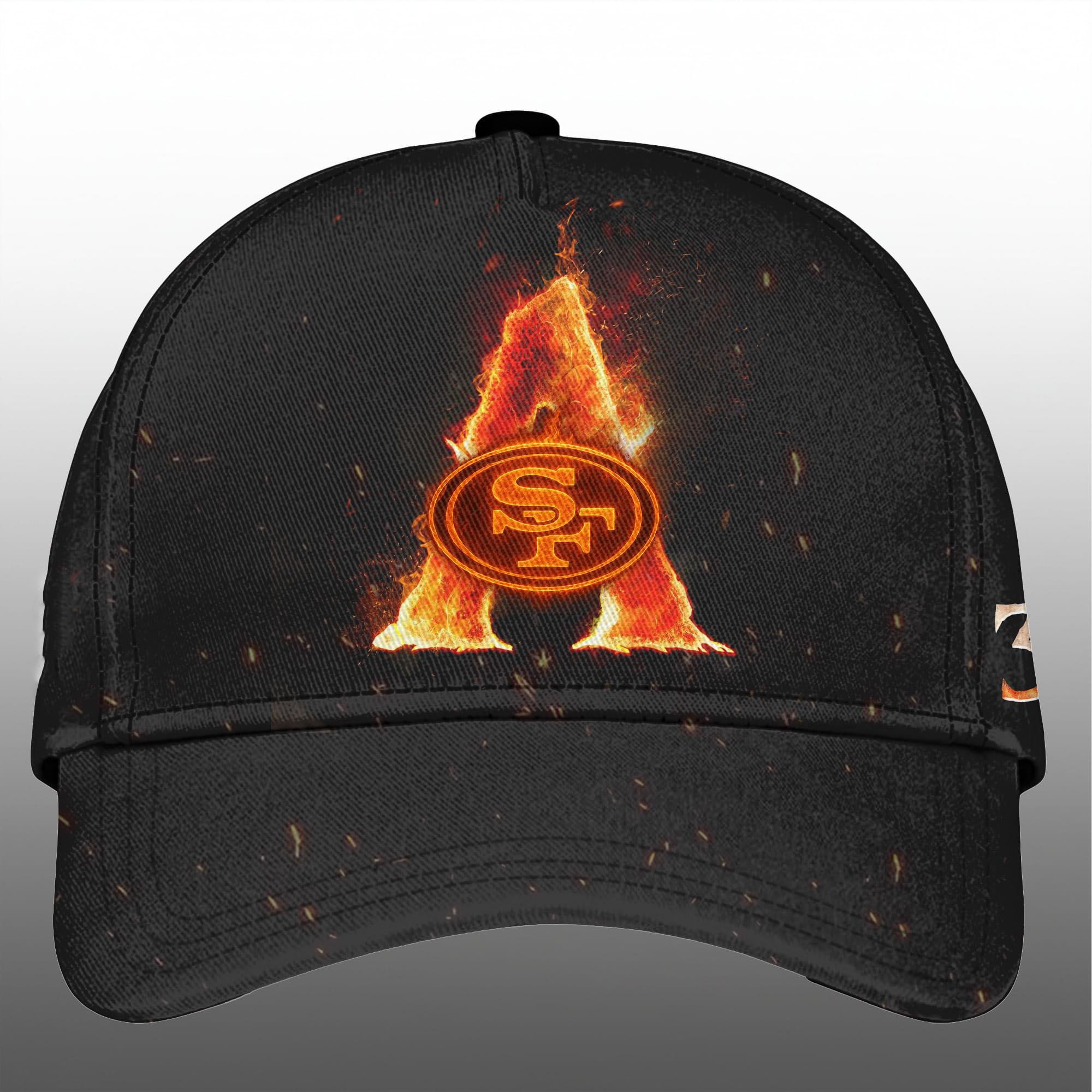 On the Back: The design creates a massive visual impact with the iconic Avatar “A” engulfed in flames, housing the SF 49ers logo at its core. Below, the subtitle “FIRE AND ASH” confirms the specific connection to the 2025 blockbuster, surrounded by realistic ember particle effects that look like they are rising off the fabric.