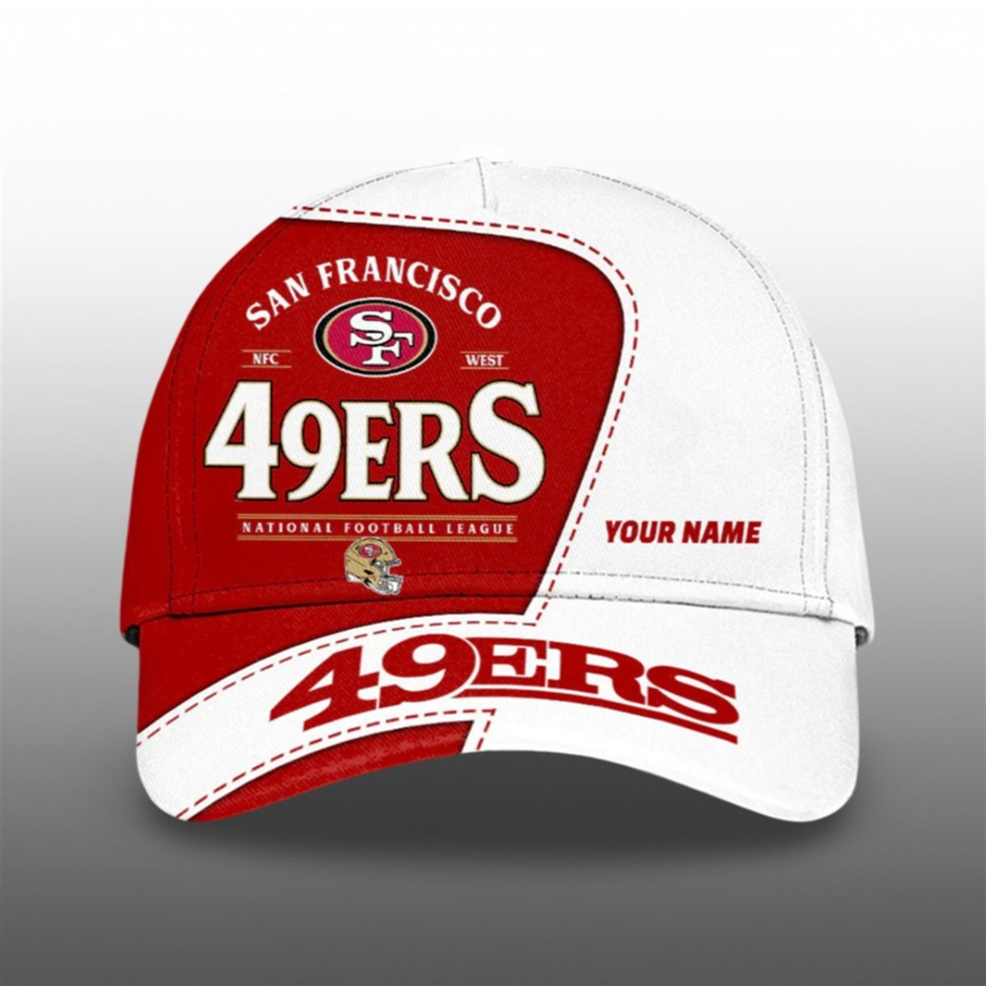 This isn’t just a hat; it’s a statement. The design features a modern, aggressive aesthetic that splits the crown into two distinct zones. The wearer’s left side is bathed in the team’s iconic scarlet red, housing the “San Francisco 49ERS” wordmark and the legendary SF oval logo, flanked by “NFC WEST” laurels. The right side features a crisp, clean white panel reserved for the most important part of the franchise: You.