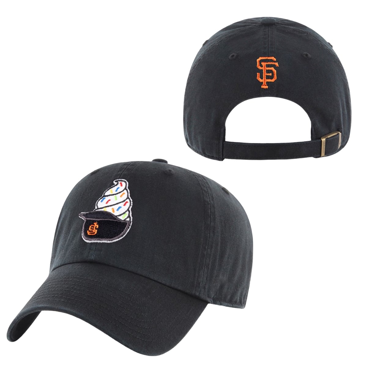 The cap completely reimagines traditional sports merchandise by injecting a massive dose of personality and fun into team apparel. Featuring a sleek, dark aesthetic, the front of the cap boasts a brilliantly embroidered graphic: a classic swirl of soft-serve ice cream, complete with colorful sprinkles, resting perfectly inside a miniature Giants batting helmet. The reverse side proudly displays the classic interlocking San Francisco Giants “SF” logo in the team’s signature vibrant orange, ensuring your allegiance is visible from every angle. This piece moves beyond standard athletic wear, positioning itself as a highly sought-after lifestyle accessory that bridges the gap between stadium life and everyday urban fashion.