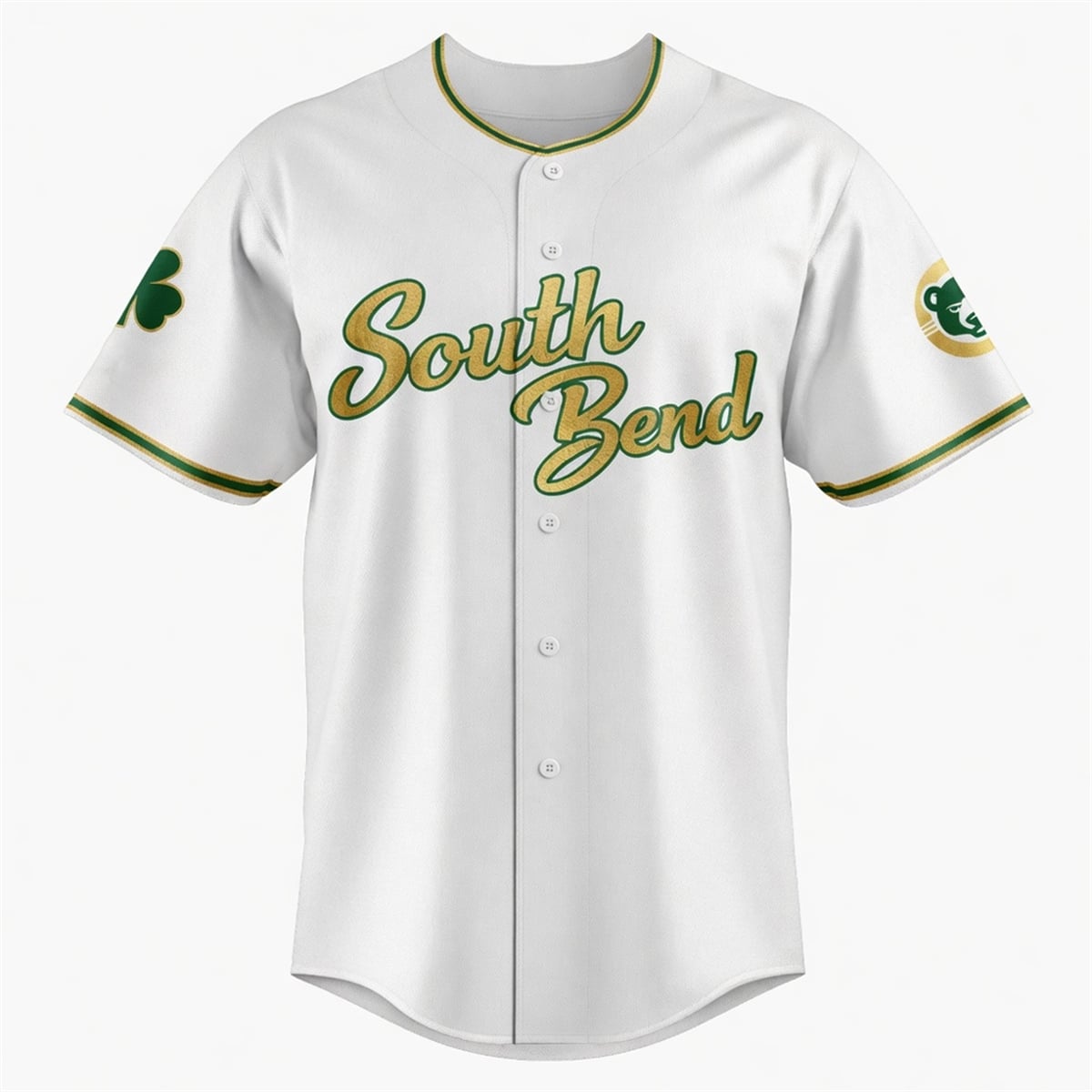 The jersey is a revolutionary piece of sports apparel that seamlessly blends the identity of a beloved baseball team with the prestige of a legendary collegiate athletic program. Visually, the jersey features a crisp, clean white base adorned with the iconic, recognizable green and gold color palette of the Fighting Irish. The front showcases the words “South Bend” in an elegant, flowing script font, heavily outlined in contrasting green and gold.