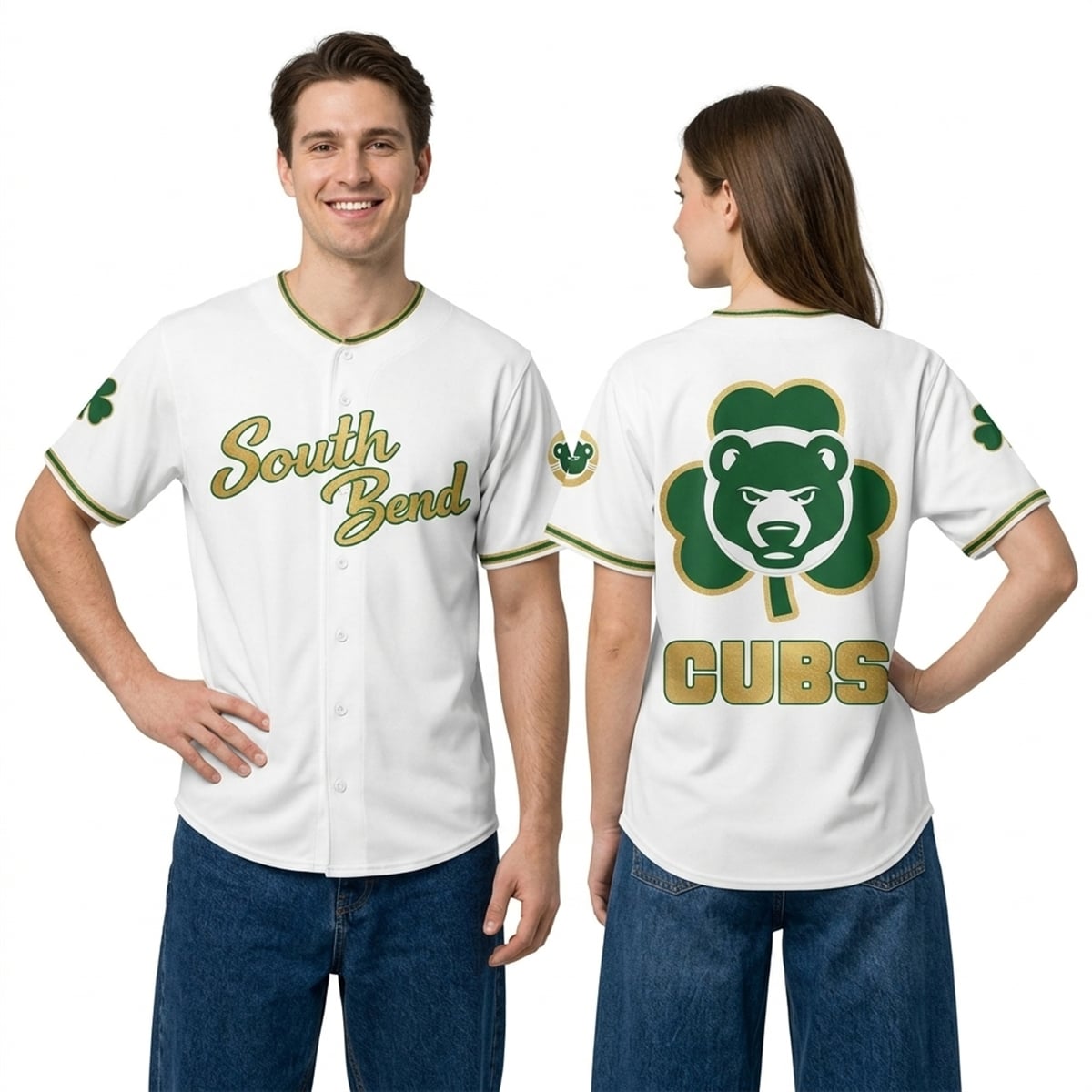 Turning to the back, the jersey reveals its crowning achievement: a massive, masterfully designed graphic that merges the fierce face of the South Bend Cubs bear directly inside a classic green shamrock, bordered in gold. Below this emblem sits the word “CUBS” in bold, block lettering. Sleeve patches featuring miniature versions of the shamrock-bear hybrid logo complete the look, making it a comprehensive and cohesive visual masterpiece.