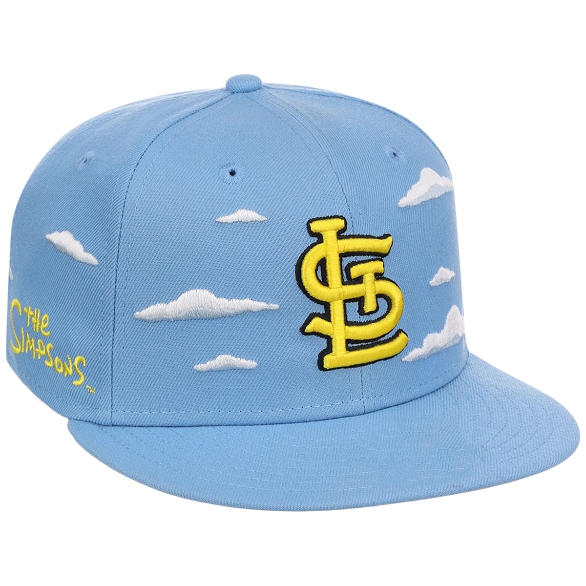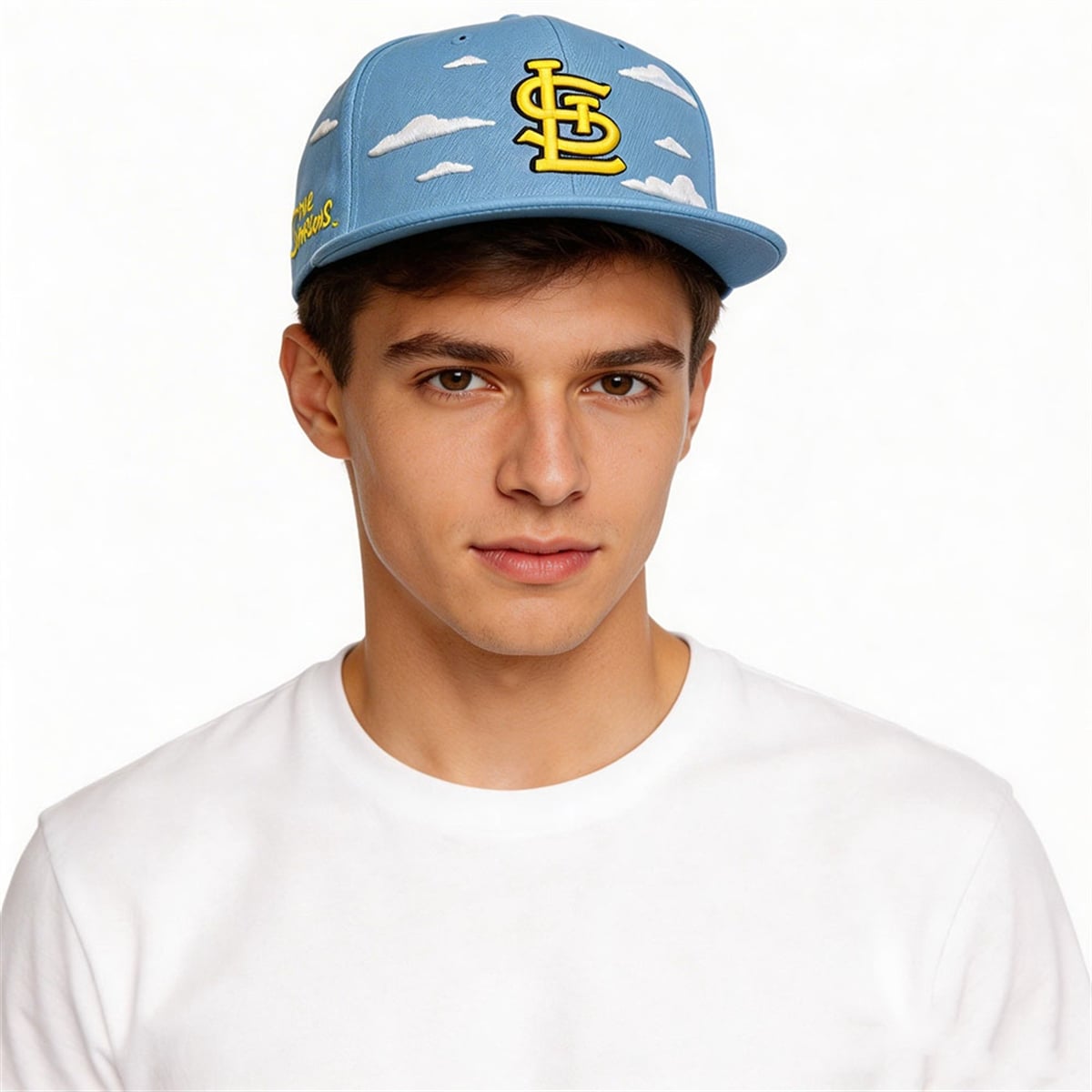 The hat is a visual masterpiece that completely reimagines traditional sports merchandise. The backdrop of the cap features a serene, vibrant light blue color, perfectly matching the iconic sky seen in the opening credits of the legendary animated series. Scattered across this blue canvas are the recognizable, stylized fluffy white clouds that instantly evoke a sense of television nostalgia. Taking center stage is the classic interlocking “StL” Cardinals logo, brilliantly rendered in a bright, eye-catching yellow that pays direct homage to the famous skin tone of the show’s beloved characters. Completing the look, the classic signature font of “The Simpsons” is prominently displayed along the side panel, authenticating this crossover.