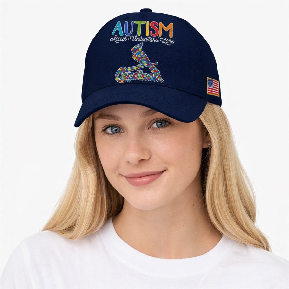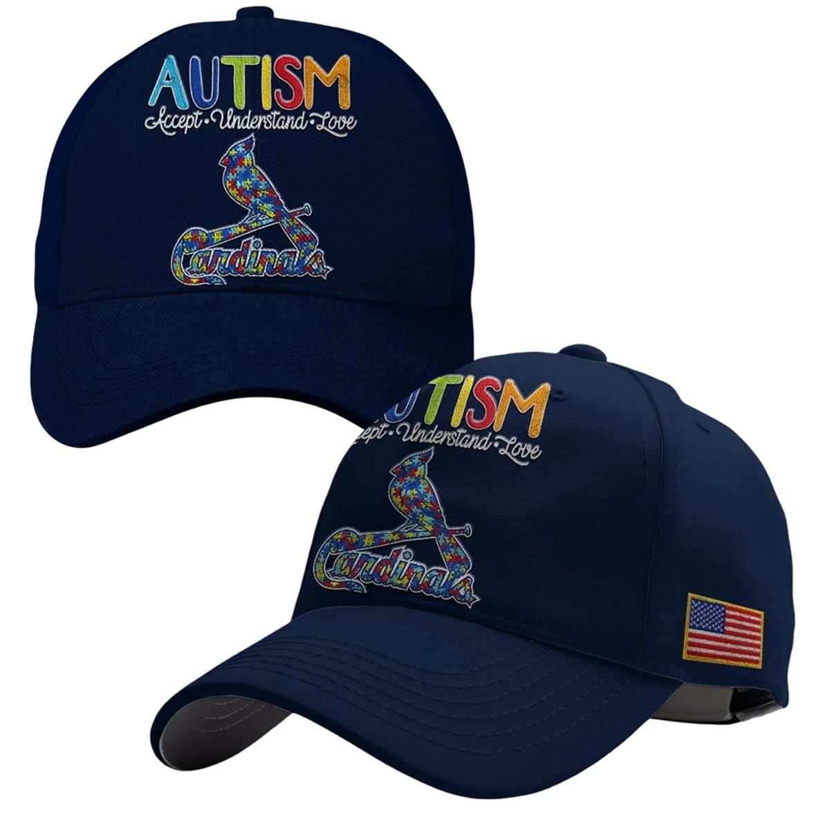 The hat is a striking piece of commemorative sports merchandise designed to honor and uplift the autism community. Set against a deep, classic navy blue background, the front of the cap boldly displays the word “AUTISM” in a spectrum of vibrant colors, directly mirroring the diversity of the autism spectrum itself. Just below, the poignant phrase “Accept • Understand • Love” is elegantly scripted, providing a clear call to action for society. The centerpiece of the design is the legendary St. Louis Cardinals logo—the familiar bird perched on a baseball bat—completely reimagined using a colorful puzzle piece motif. To complete the design, a classic American flag patch is proudly displayed on the side panel, symbolizing national unity in the push for greater acceptance and inclusion.