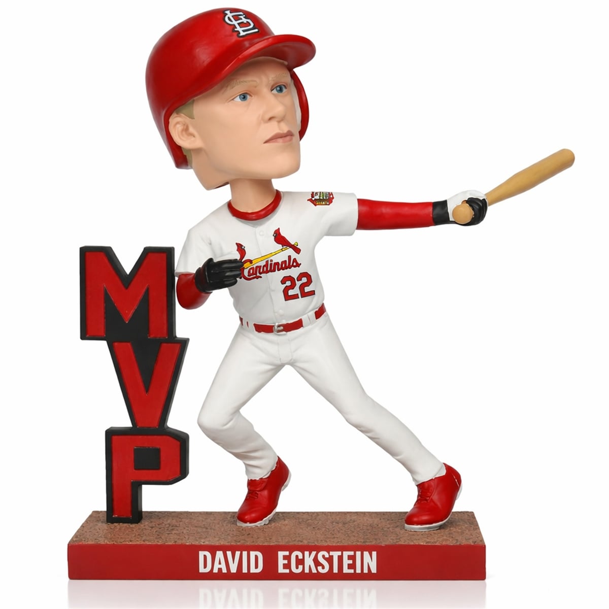 The figure portrays Eckstein mid-swing, wearing his classic white home jersey with the iconic birds on the bat logo and his recognizable number 22. Standing proudly beside him are massive, red and black block letters spelling out “MVP,” cementing his legacy in physical form.