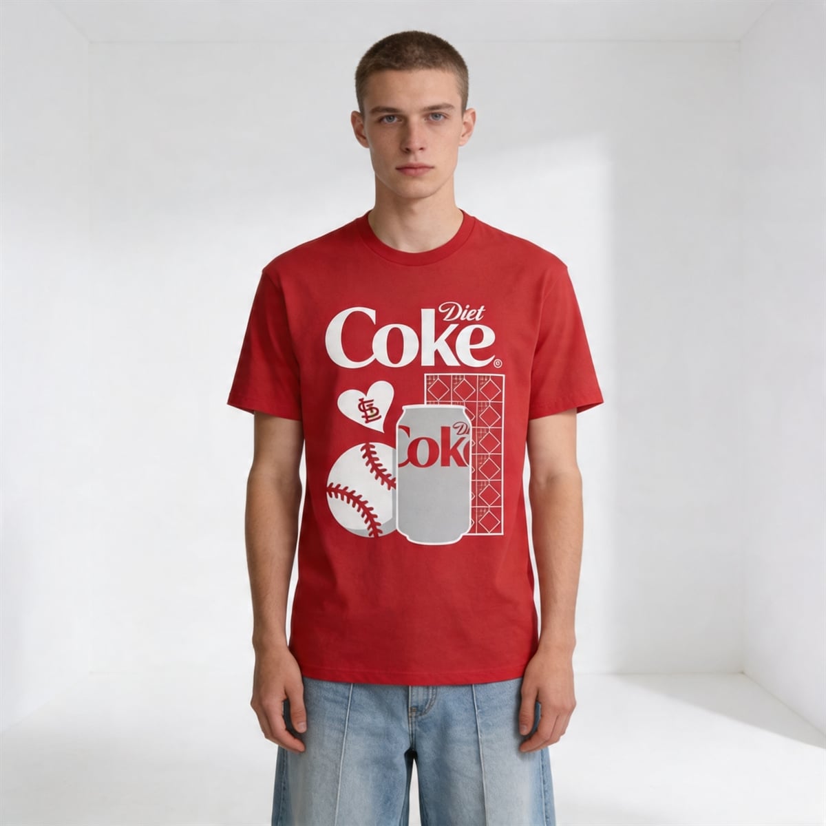 The shirt is a visual celebration of summer nights at the ballpark. The design utilizes a vibrant cardinal red base that serves as the perfect canvas for a dynamic, multi-layered graphic. At the top, the classic white “Diet Coke” typography commands attention. Below it, the shirt weaves a story of dual fandom: a white heart proudly displaying the iconic interlocking St Louis Cardinals “StL” logo, paired right next to a traditional baseball graphic with bold red stitching. Standing front and center is a stylized silver soda can, set against a retro-inspired geometric diamond pattern.