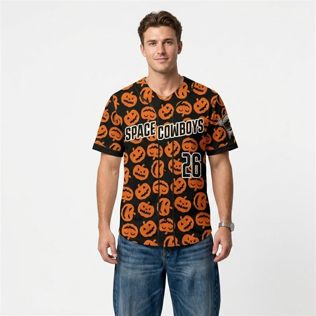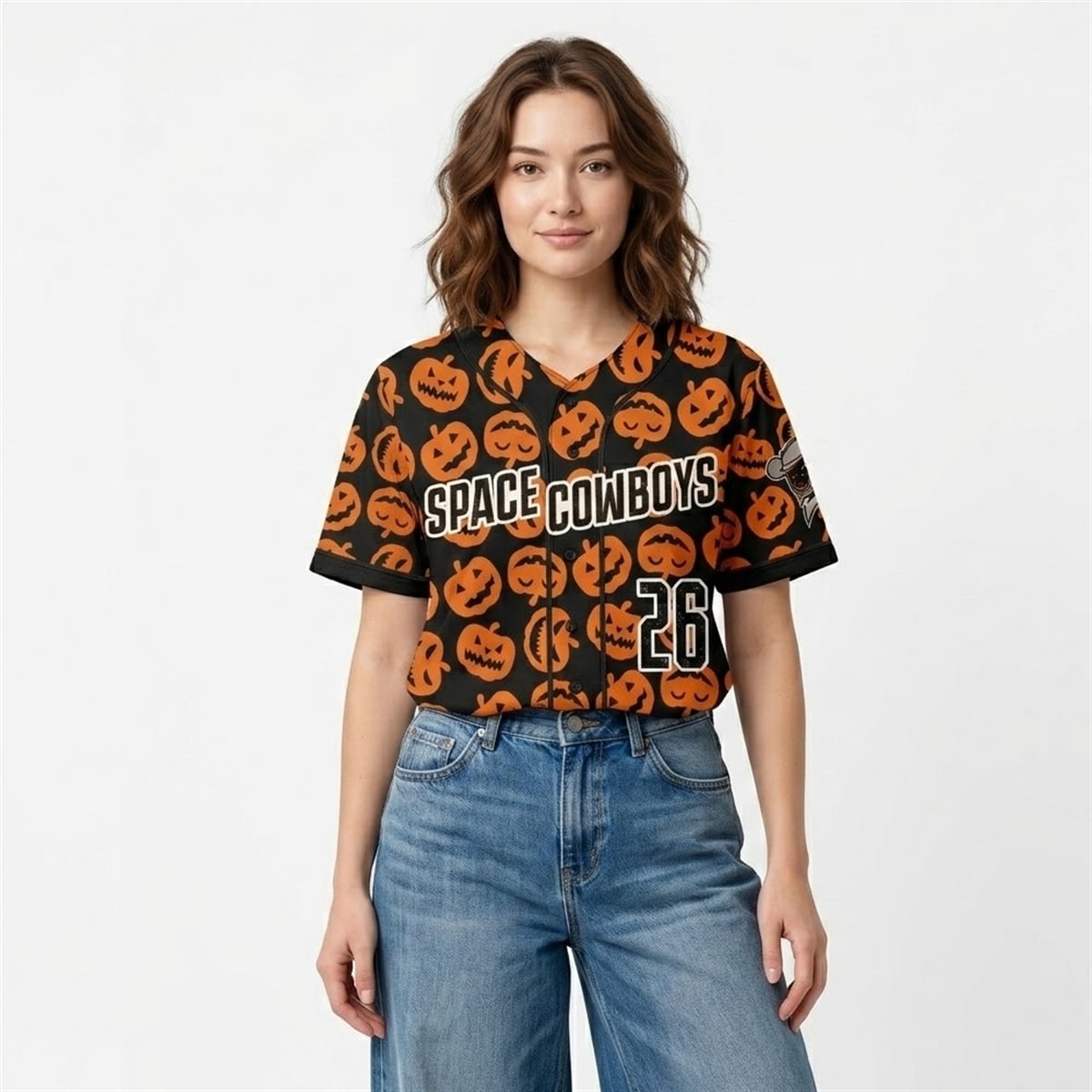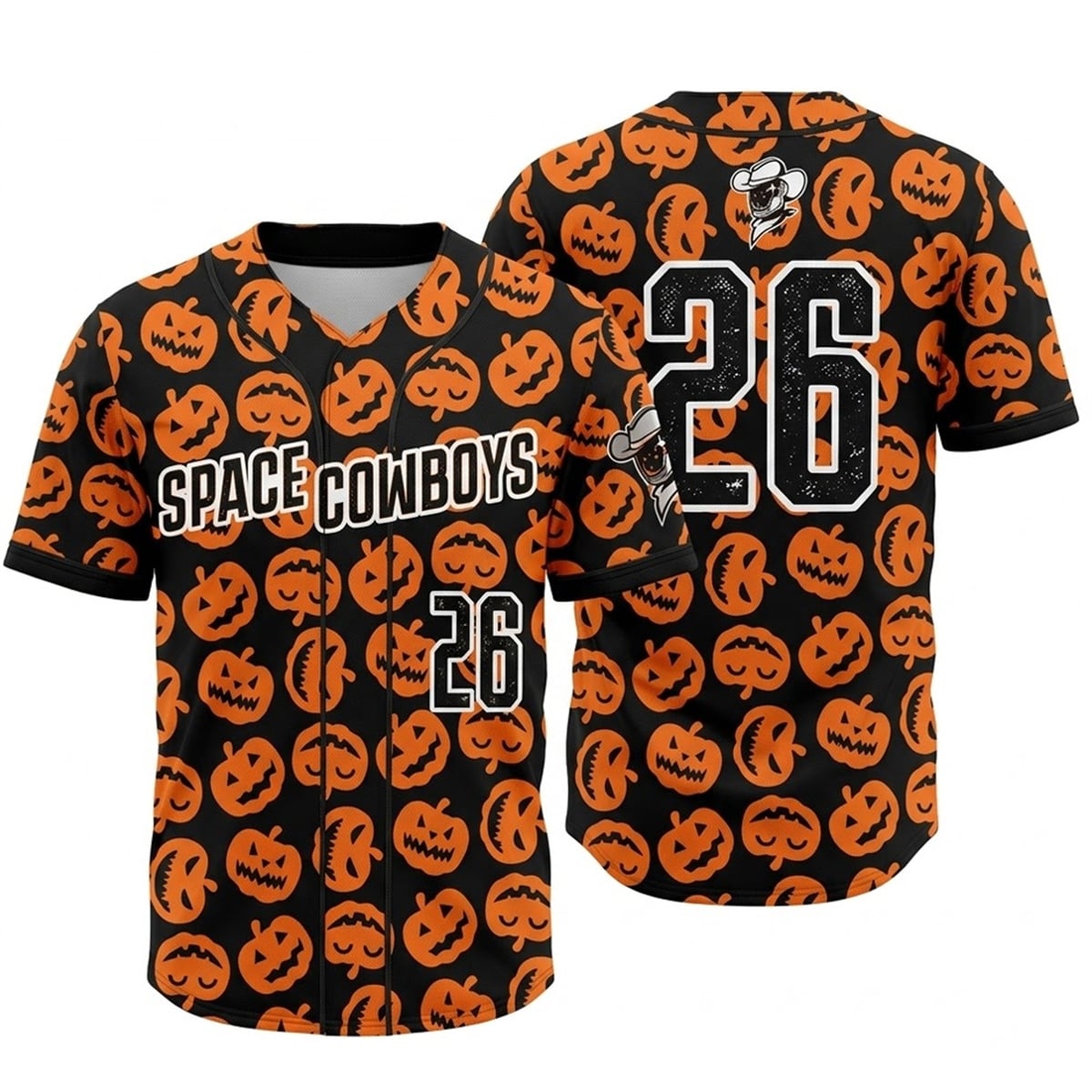The jersey is a visual masterpiece that completely reimagines traditional baseball aesthetics. The entire garment serves as a canvas for a dynamic, repeating pattern of orange jack-o’-lanterns, each featuring distinctly carved, mischievous expressions. Set against a pitch-black background, the neon-orange pumpkins pop with an electrifying contrast. Across the chest, the “SPACE COWBOYS” moniker is displayed in bold, stark white typography, outlined to ensure maximum legibility against the complex background pattern.