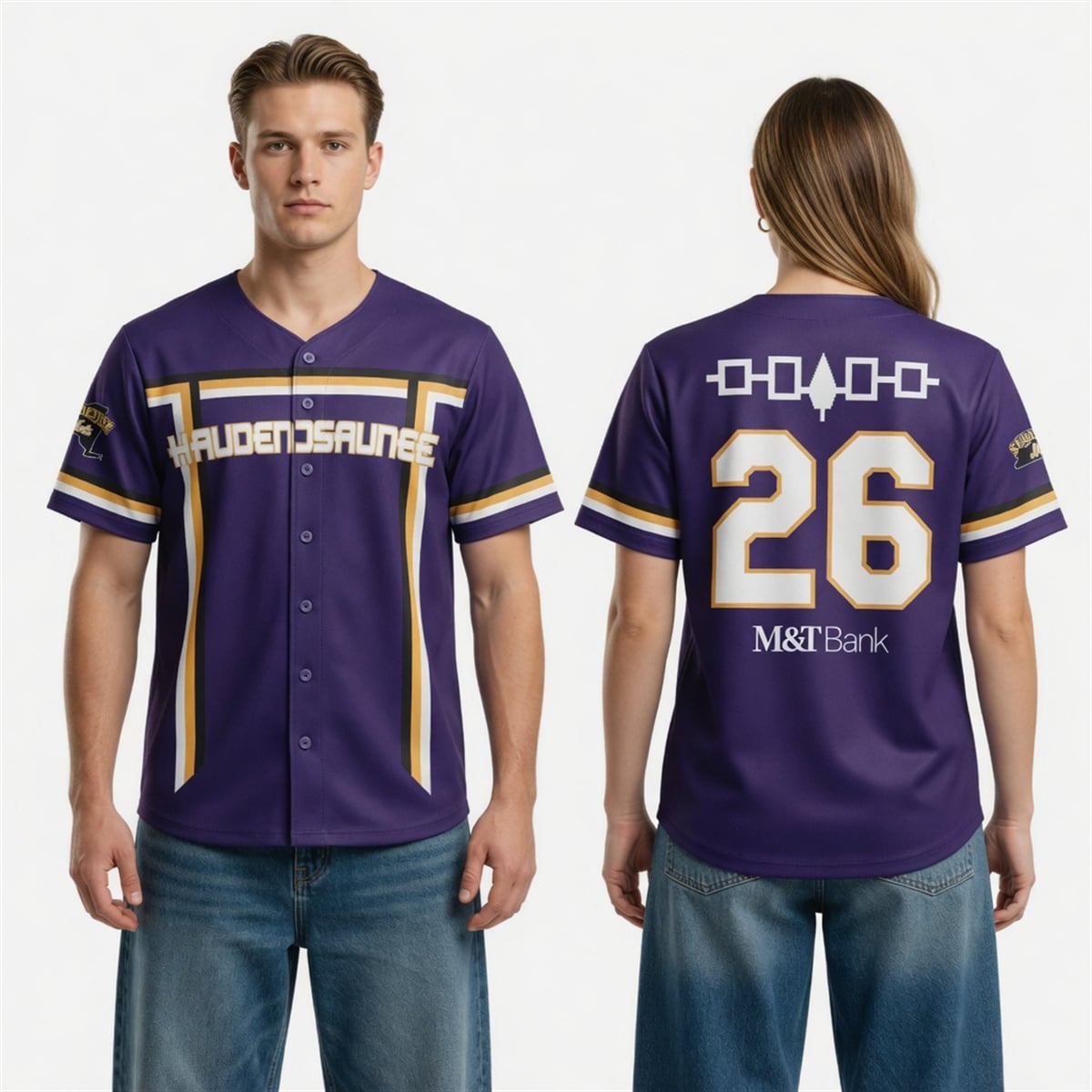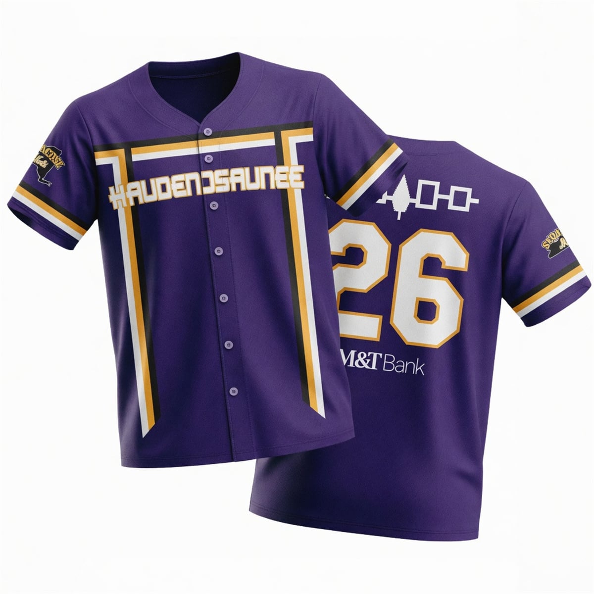 The jersey is an exclusive promotional collectible released during the baseball season. Characterized by its brilliant purple base, sharp gold and black striping, and distinct geometric typography, the design breaks away from standard team branding to proudly display “HAUDENOSAUNEE” across the chest. The reverse side features the iconic Hiawatha Belt motif resting just above the player number “26” and the M&T Bank sponsor logo, while the traditional Syracuse Mets emblem is thoughtfully placed on the right sleeve.