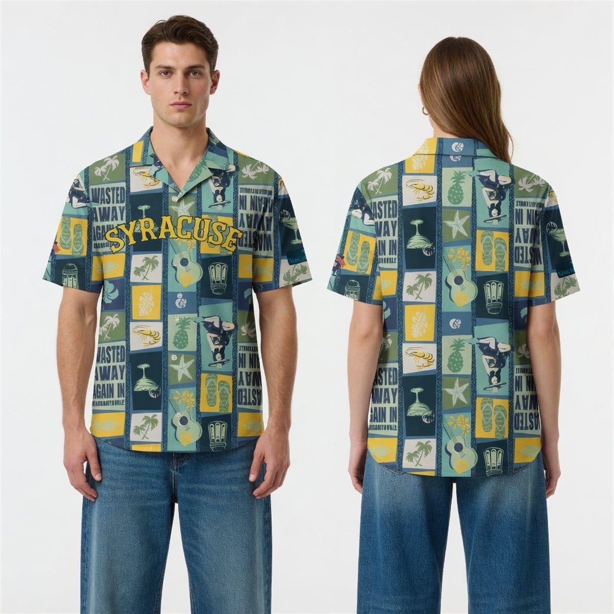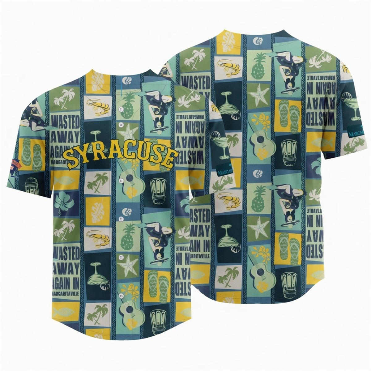 The jersey is a visual feast that completely reimagines traditional sports uniforms. The design employs a dynamic, block-style patchwork pattern drenched in cool ocean teals, deep navy blues, sunny yellows, and lush palm greens. Across the chest, the “SYRACUSE” geographic moniker is proudly displayed in a stylized, arched yellow typography that mimics classic baseball lettering while fitting seamlessly into the tropical theme.