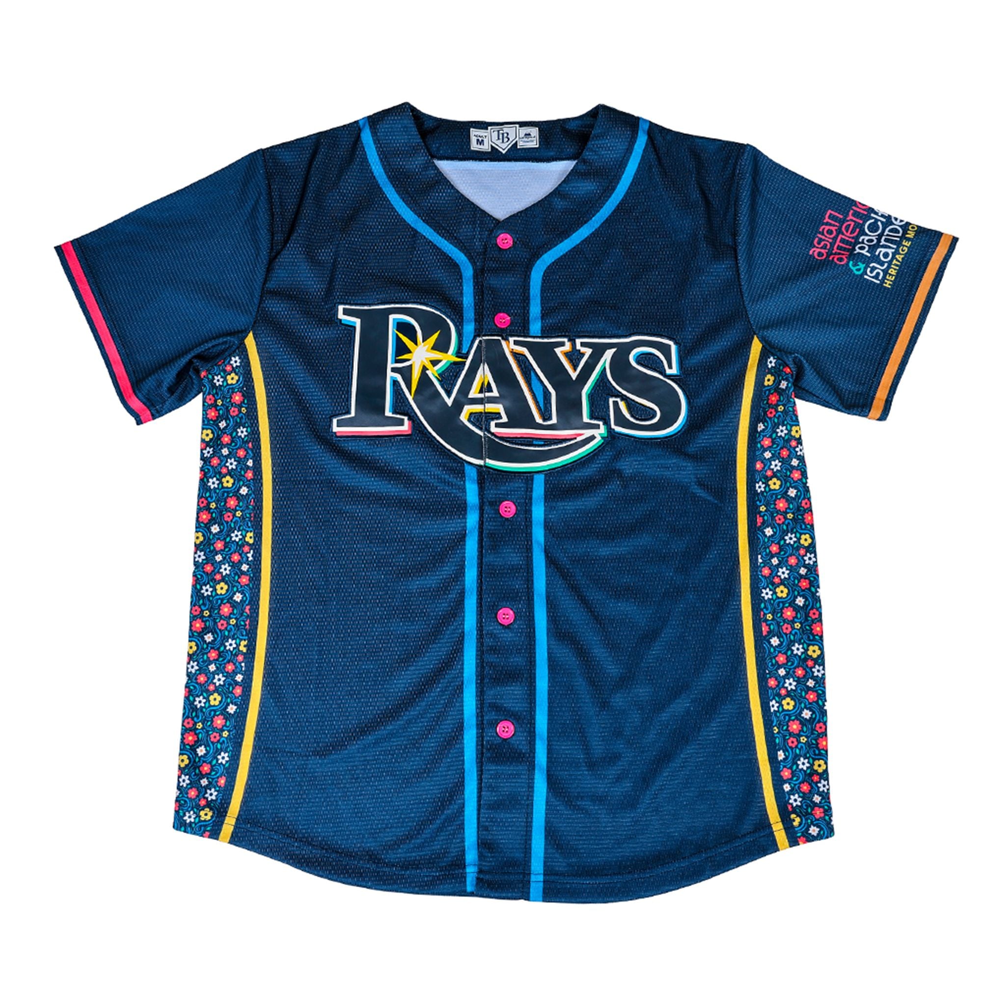 This jersey is an exclusive promotional giveaway item meticulously designed to commemorate Asian American and Pacific Islander Heritage Month. The visual design is truly striking, pairing the traditional deep navy blue base of the Rays with vivid, contrasting elements. Bright cyan piping outlines the placket, leading down to distinct, pop-color pink buttons. The focal point of the jersey’s uniqueness lies in the exquisite, multi-colored floral patterned panels cascading down the sides, offering a beautiful visual homage to AAPI cultures. A specialized “Asian American & Pacific Islander Heritage Month” patch proudly adorns the left sleeve, completing the culturally rich aesthetic.