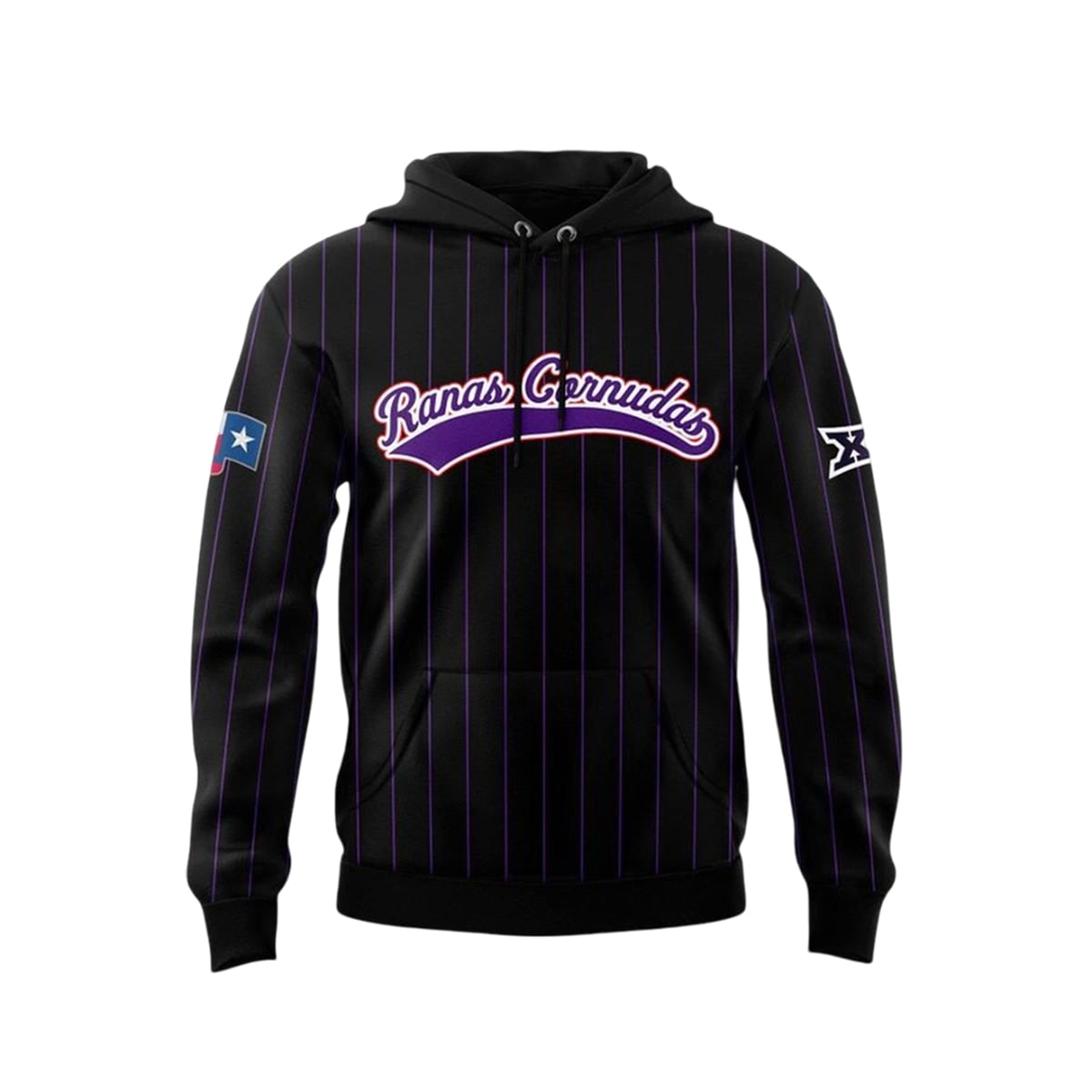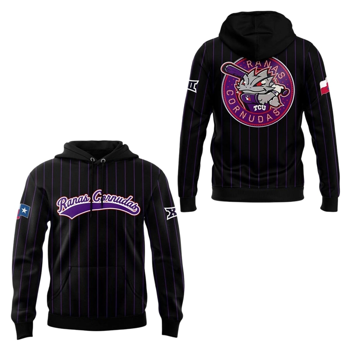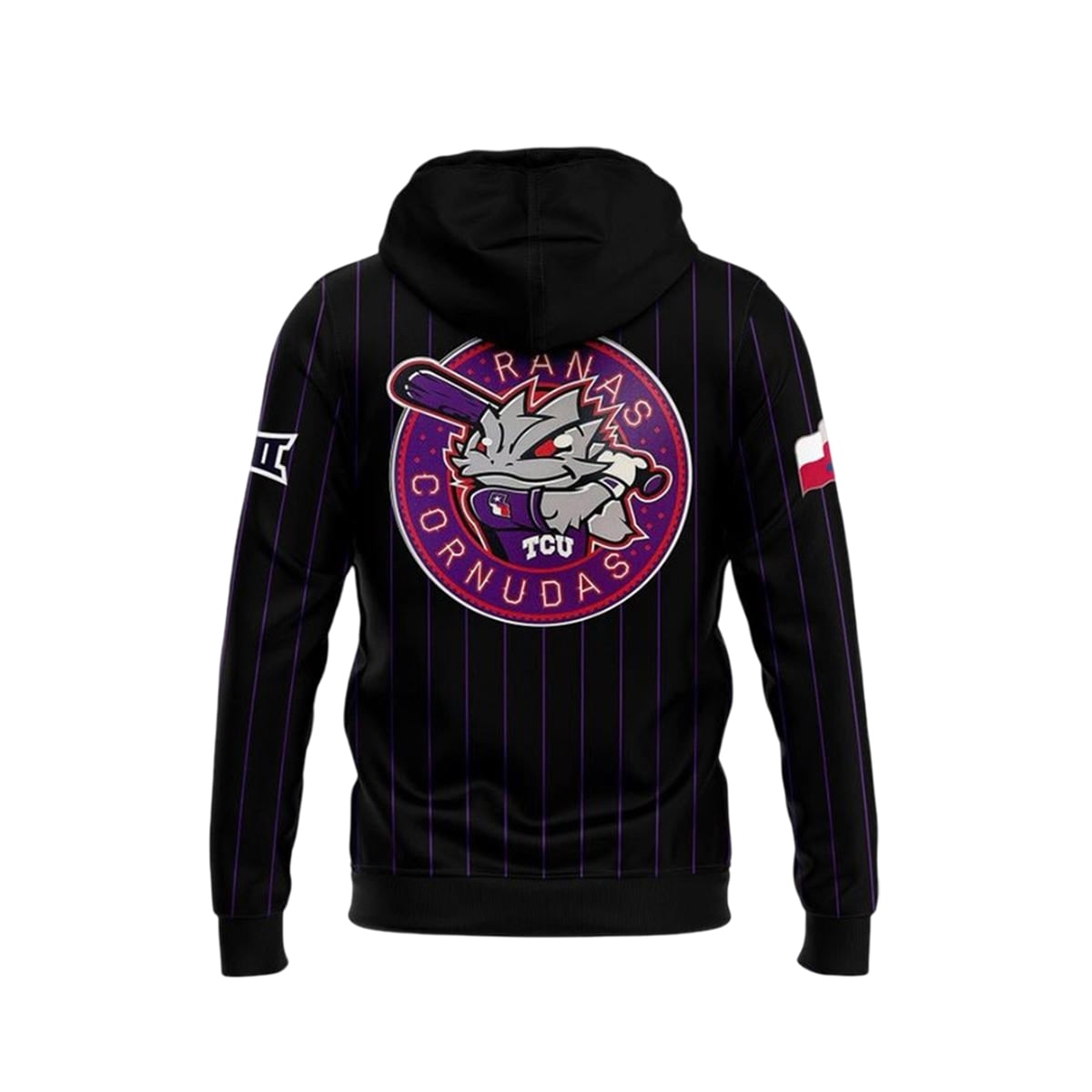 On the reverse, the hoodie features an oversized, circular crest. Inside this bold emblem is a fierce, stylized version of the university’s mascot, gripping a purple baseball bat and ready for a pitch, surrounded by starry accents. Adding to its authenticity and regional pride, the right sleeve is adorned with a custom-styled Texas state flag patch, while the left sleeve bears the prominent insignia of the Big 12 Conference.