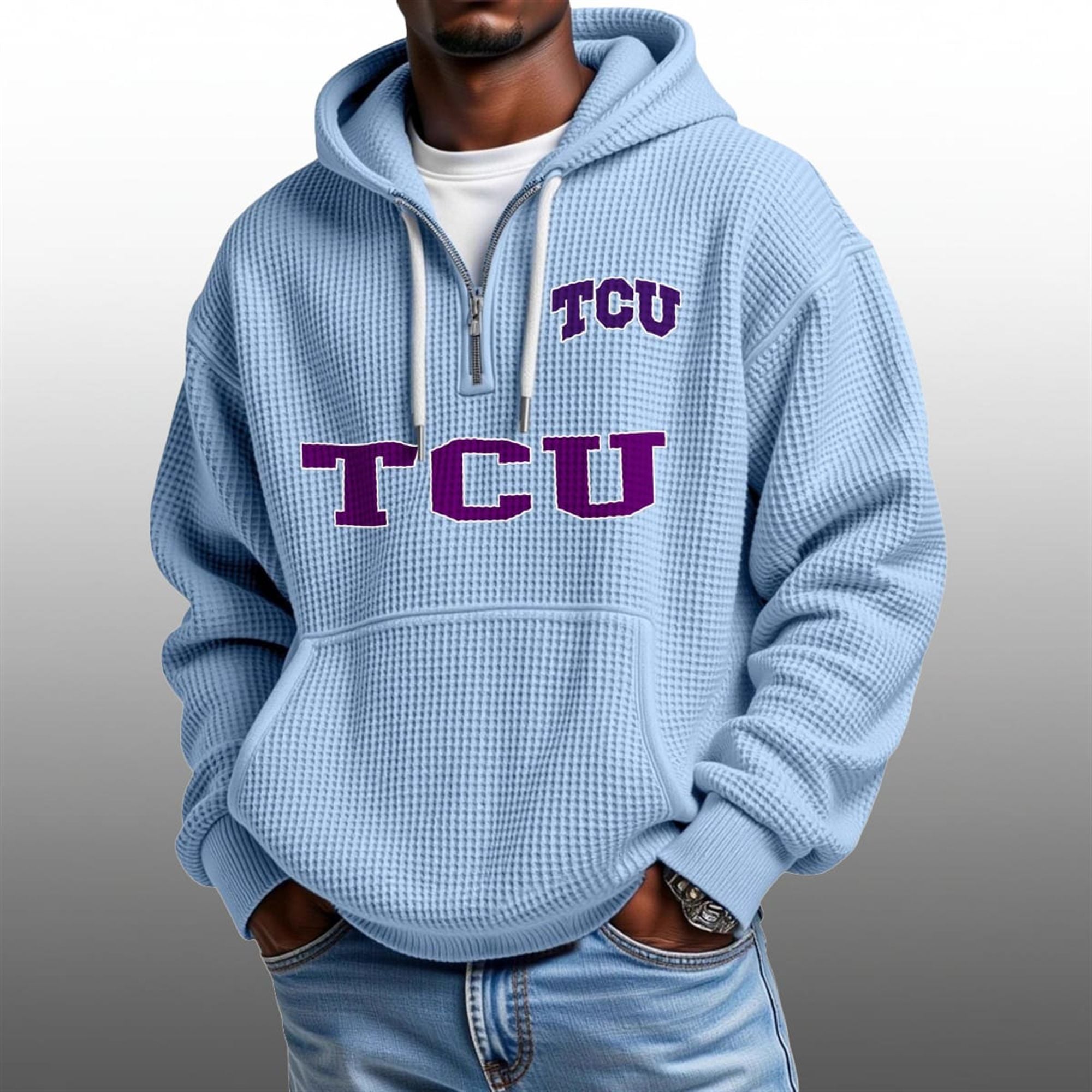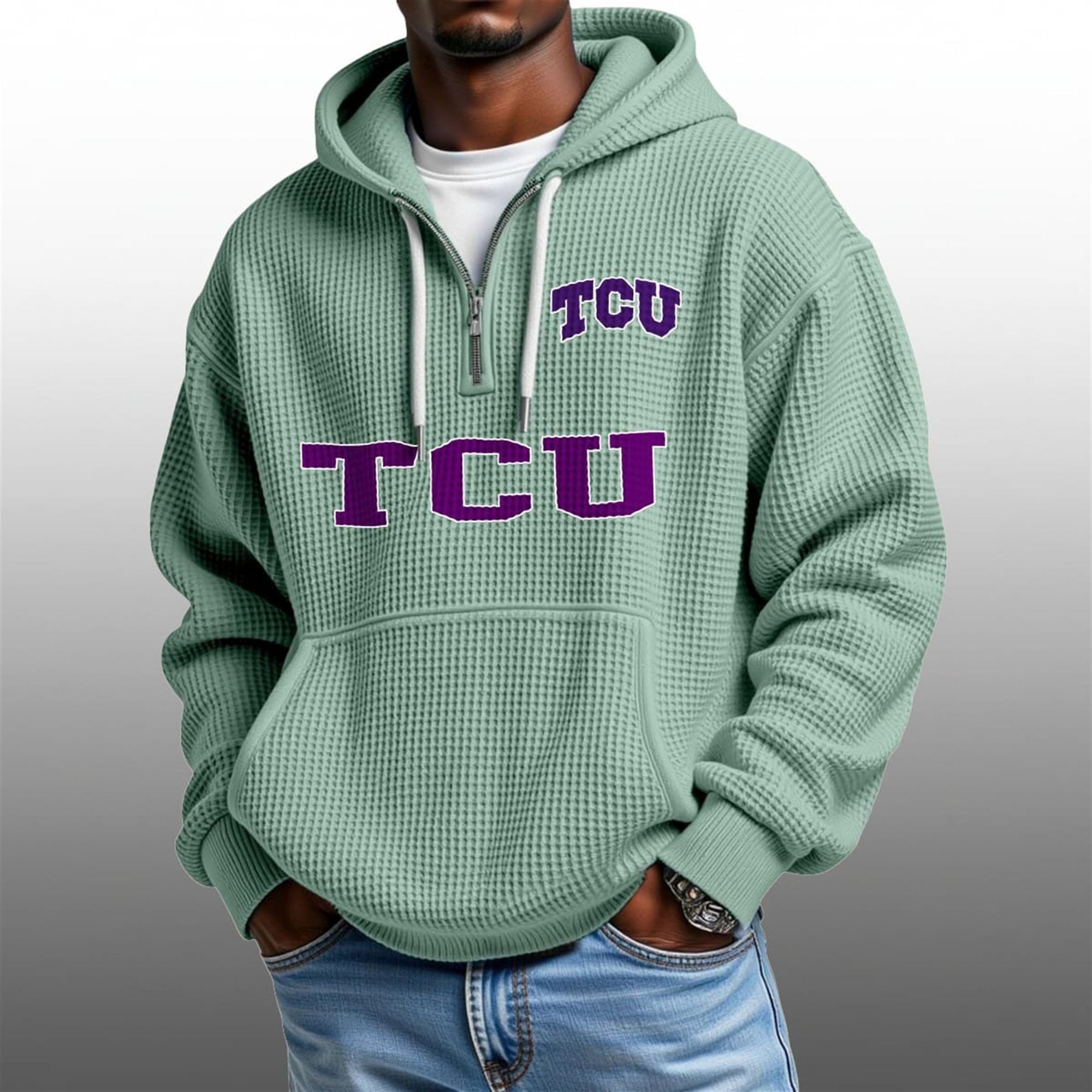 The “TCU” text is applied using a high-quality appliqué method with white piping, ensuring the logo pops against the textured background. The quarter-zip neckline adds versatility, allowing for easy ventilation during tense game moments or warmth when the temperature drops. Finished with a spacious kangaroo pocket and ribbed cuffs, this hoodie is engineered for everyday functionality.