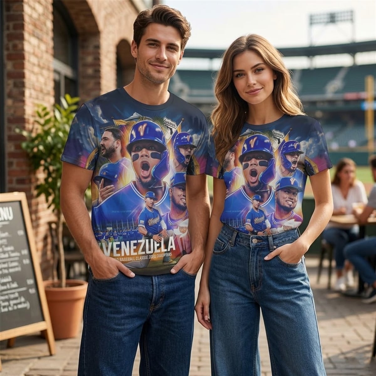The shirt is a vibrant, full-coverage visual celebration of an unprecedented sporting achievement. The design is a dynamic collage of victory, heavily featuring the nation’s iconic navy blue, vibrant red, and striking yellow color palette. Front and center, larger-than-life depictions of Venezuela’s baseball heroes roar in triumph, wearing their signature “V” helmets. Beneath the euphoric player portraits sits the unmistakable World Baseball Classic championship trophy, gleaming next to the bold, undeniable declaration: “VENEZUELA.” This piece is engineered as a visual mural, seamlessly blending the soaring emotions of the players with the patriotic pride of the national flag sweeping across the background.