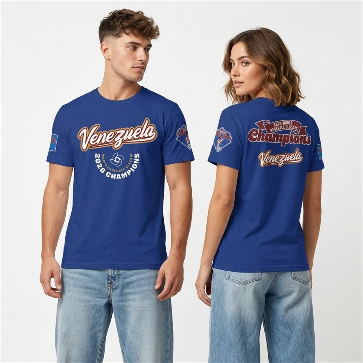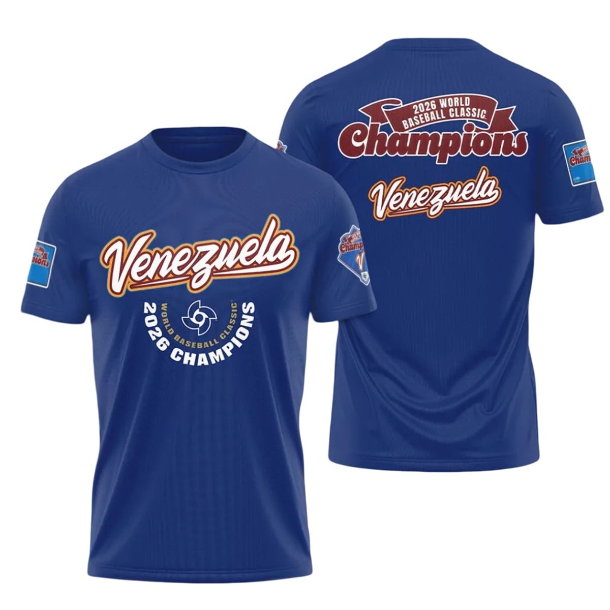 The shirt is a visual masterpiece dedicated to international baseball supremacy. The item utilizes a deep, vibrant blue foundation that serves as the perfect canvas for the celebratory graphics. On the front, a sweeping, stylized “Venezuela” script dominates the chest, outlined in contrasting colors that make the lettering pop. Directly below, the 2026 World Baseball Classic Champions insignia is proudly displayed, anchoring the design with undeniable authority.