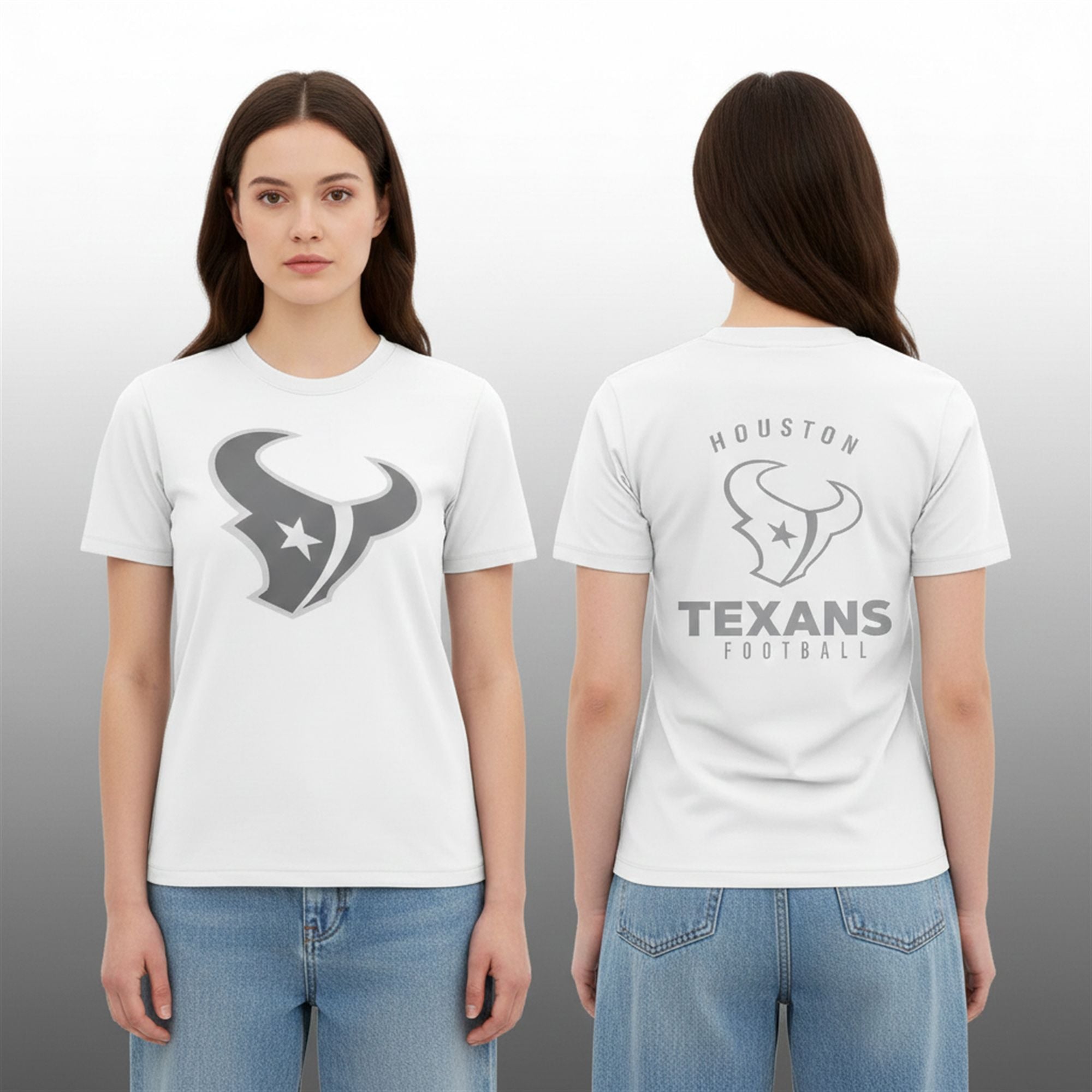 This product features a stark, brilliant white canvas contrasted by a sleek, silver-grey outline of the iconic Bull Head logo. The back displays a proud, arched “HOUSTON” over a bold “TEXANS FOOTBALL” wordmark, ensuring that your allegiance is visible from every angle without overwhelming the senses. It is the perfect apparel choice for the fan who wants to stand out by blending in with the “White Out” crowd.