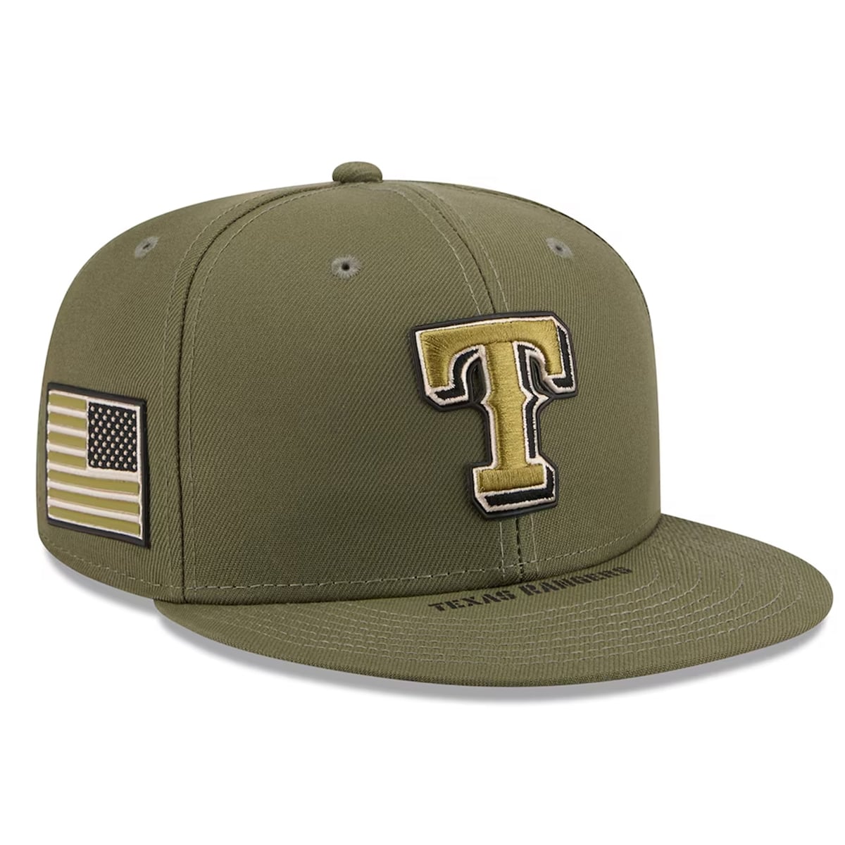 The hat carries significant emotional and cultural weight. The dominant olive green hue is a universal symbol of the armed forces, instantly conveying a sense of duty, honor, and camouflage heritage. The inclusion of the American flag on the side panel is a direct salute to the nation, transforming the cap from a simple sports accessory into a patriotic emblem. The metallic gold trim surrounding the Texas Rangers ‘T’ is symbolic of excellence, victory, and the high esteem in which the military community is held. Wearing this hat is a silent but powerful way to communicate gratitude to those who protect the country.