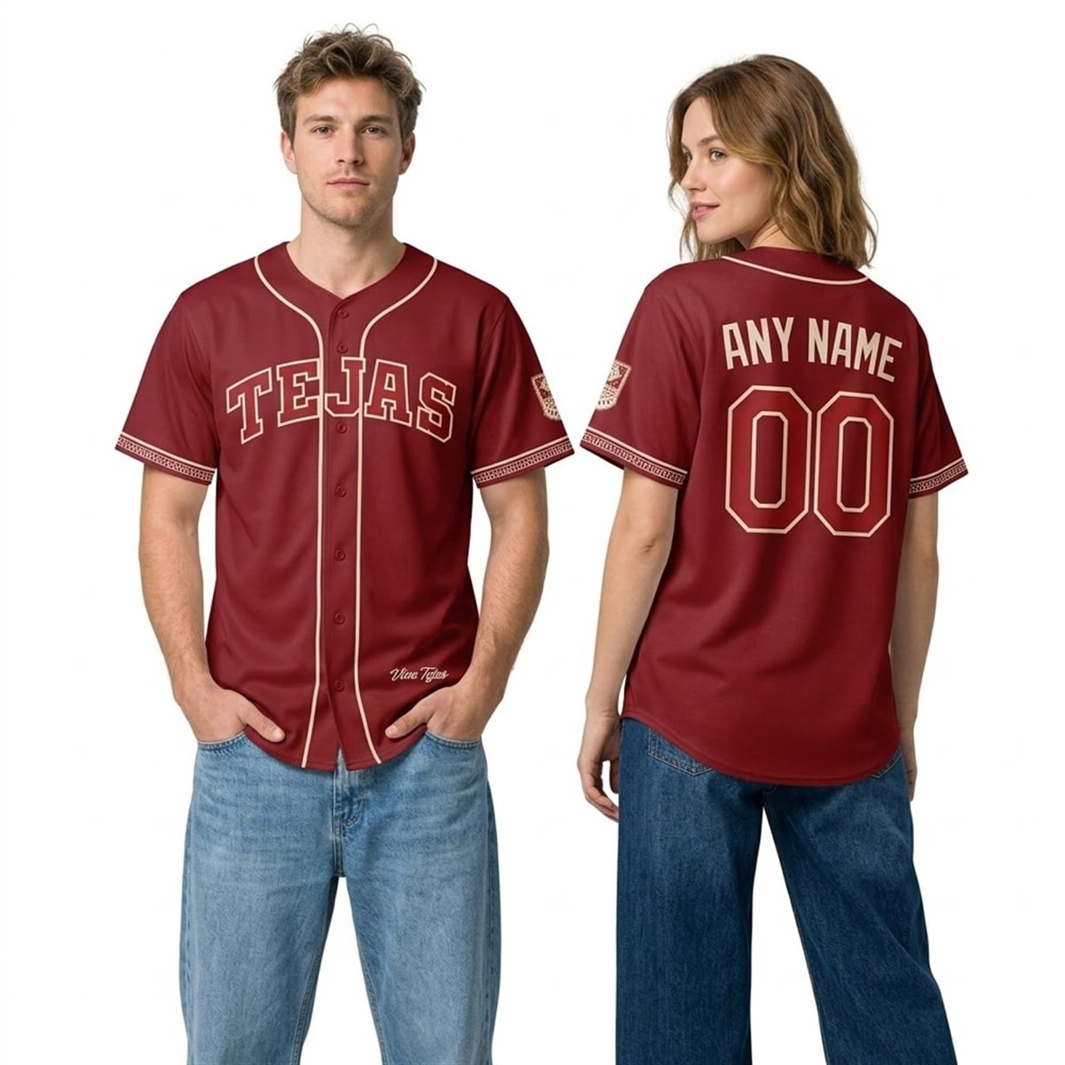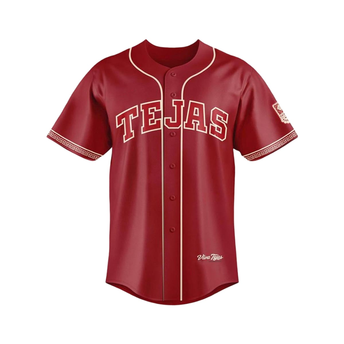 The jersey offers a revolutionary visual departure from standard team colorways. It features a stunning crimson base, beautifully contrasted by elegant cream piping along the placket and collar. Across the chest, the word “TEJAS” is proudly displayed in bold, classic baseball typography. The sleeves are accented with an intricate, Southwestern-inspired geometric trim, accompanied by a culturally resonant emblem on the sleeve. Near the bottom hem, the phrase “Viva Tejas” adds a finishing touch of regional pride. The back of the jersey is fully customizable, allowing fans to add their own name and preferred number.