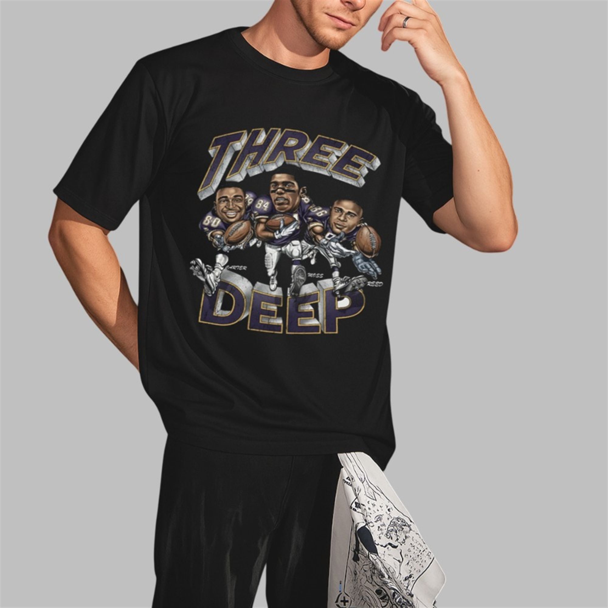 The graphic is framed by massive, 3D block text reading “THREE DEEP,” rendered in a distressed vintage finish that gives it an authentic “thrifted” look right out of the package. Printed on a high-quality black tee, the vibrant purple and gold colors pop, ensuring that your fandom is visible from the cheap seats.