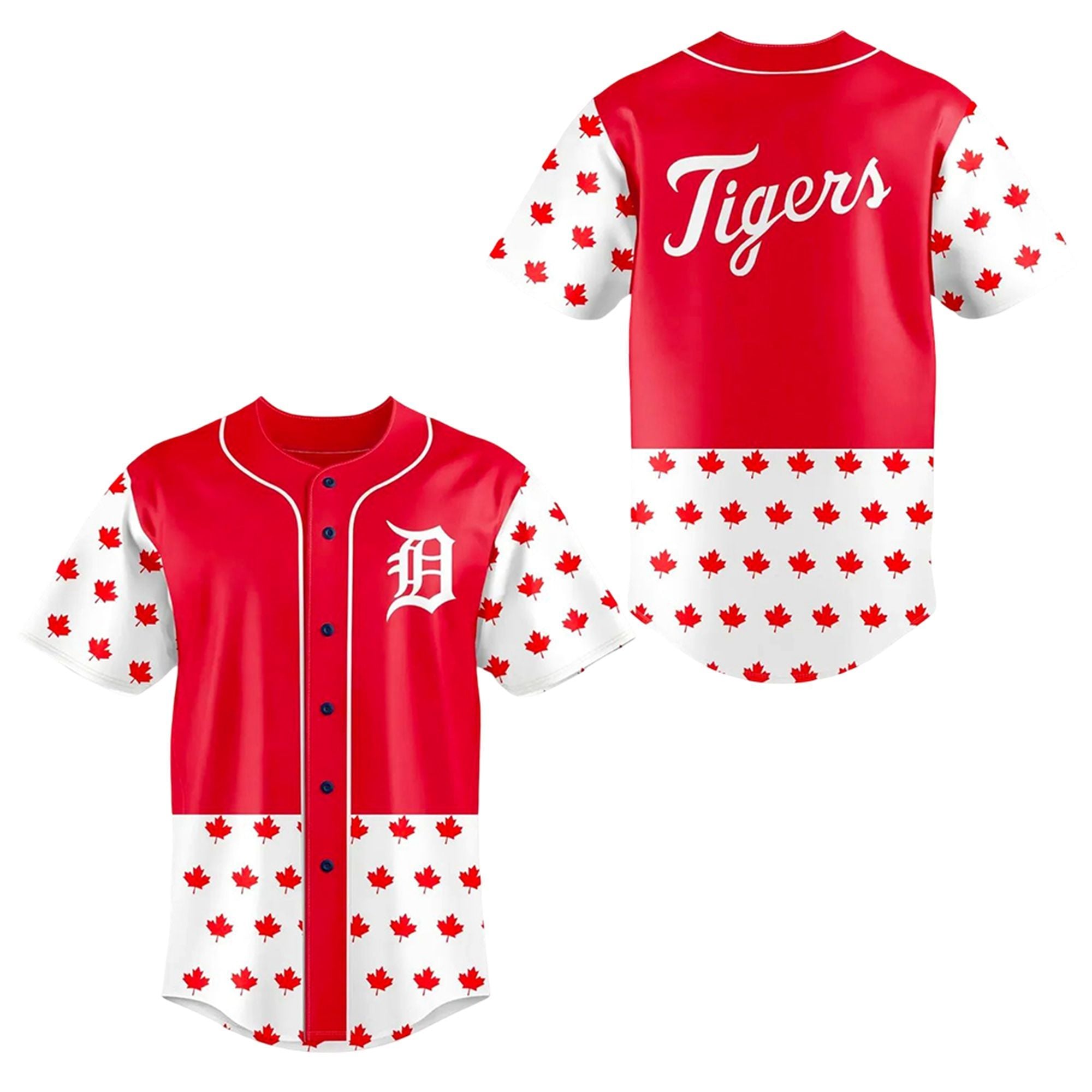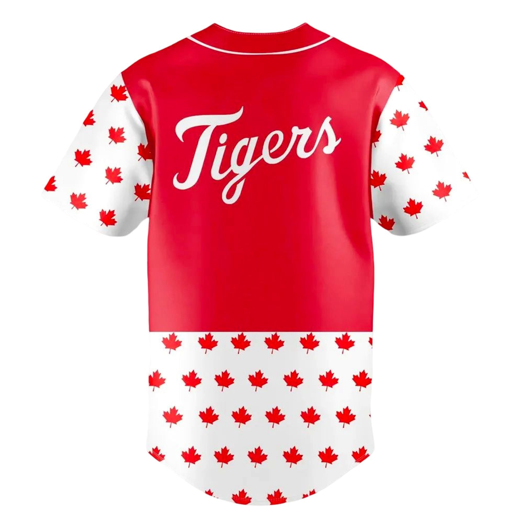 This vibrant upper section transitions seamlessly into a crisp white lower half and matching sleeves, which are abundantly adorned with a cascading pattern of red maple leaves. Turning the apparel reveals the classic, flowing “Tigers” script sweeping elegantly across the upper shoulders. Designed specifically for the 2026 promotional calendar as a stadium giveaway, this striking visual piece serves as a wearable tribute to the massive international fan base that consistently crosses the border to support the team. It is a brilliant visual celebration of unity, sportsmanship, and regional pride that deviates beautifully from the team’s traditional navy and orange colorways.