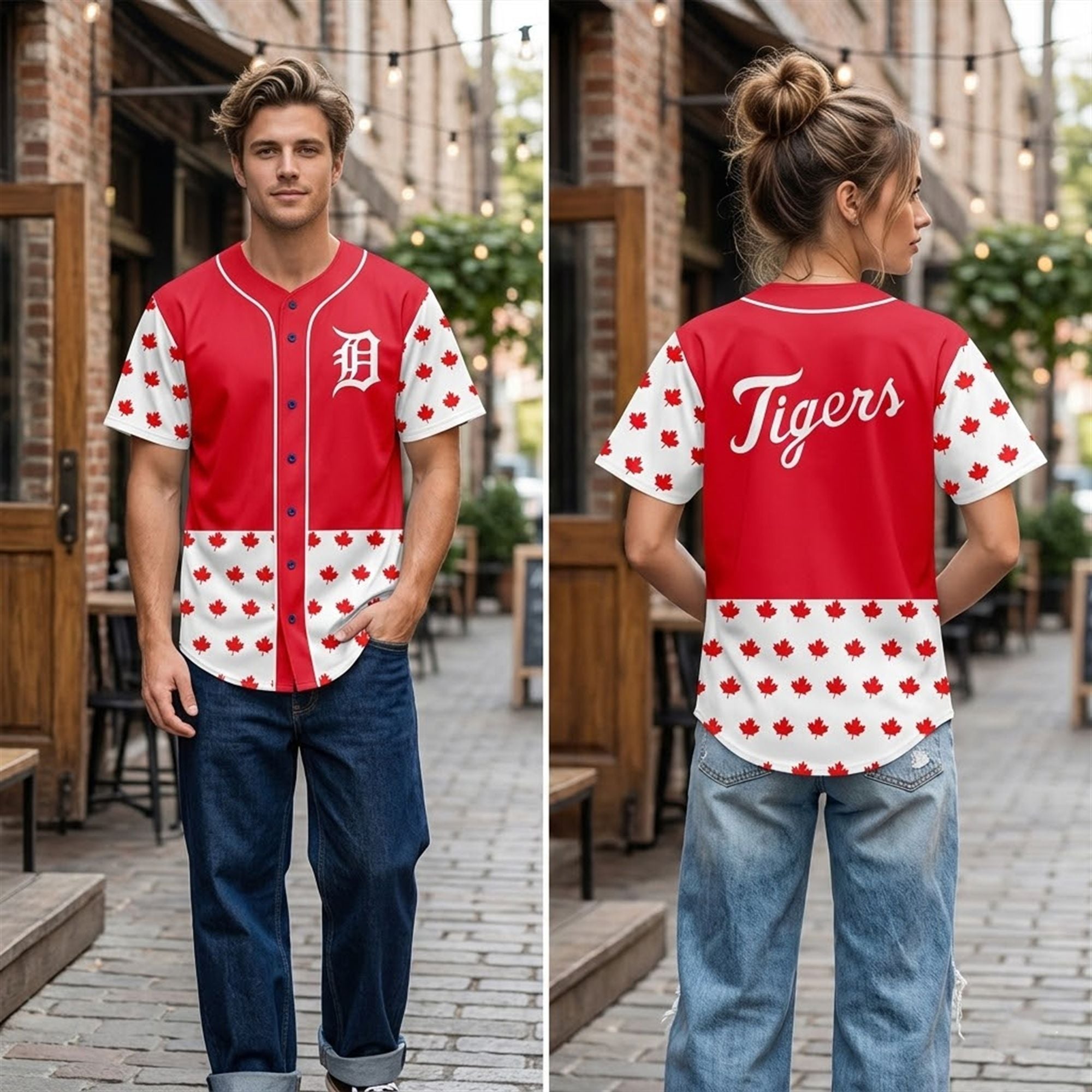 The jersey represents a monumental celebration of the enduring connection between the Motor City and its international neighbors across the Detroit River. Visually, the piece is a striking and immediate fusion of two iconic identities. The upper torso features a bold, commanding red, anchored gracefully by the legendary Detroit Tigers Old English ‘D‘ resting on the left chest.