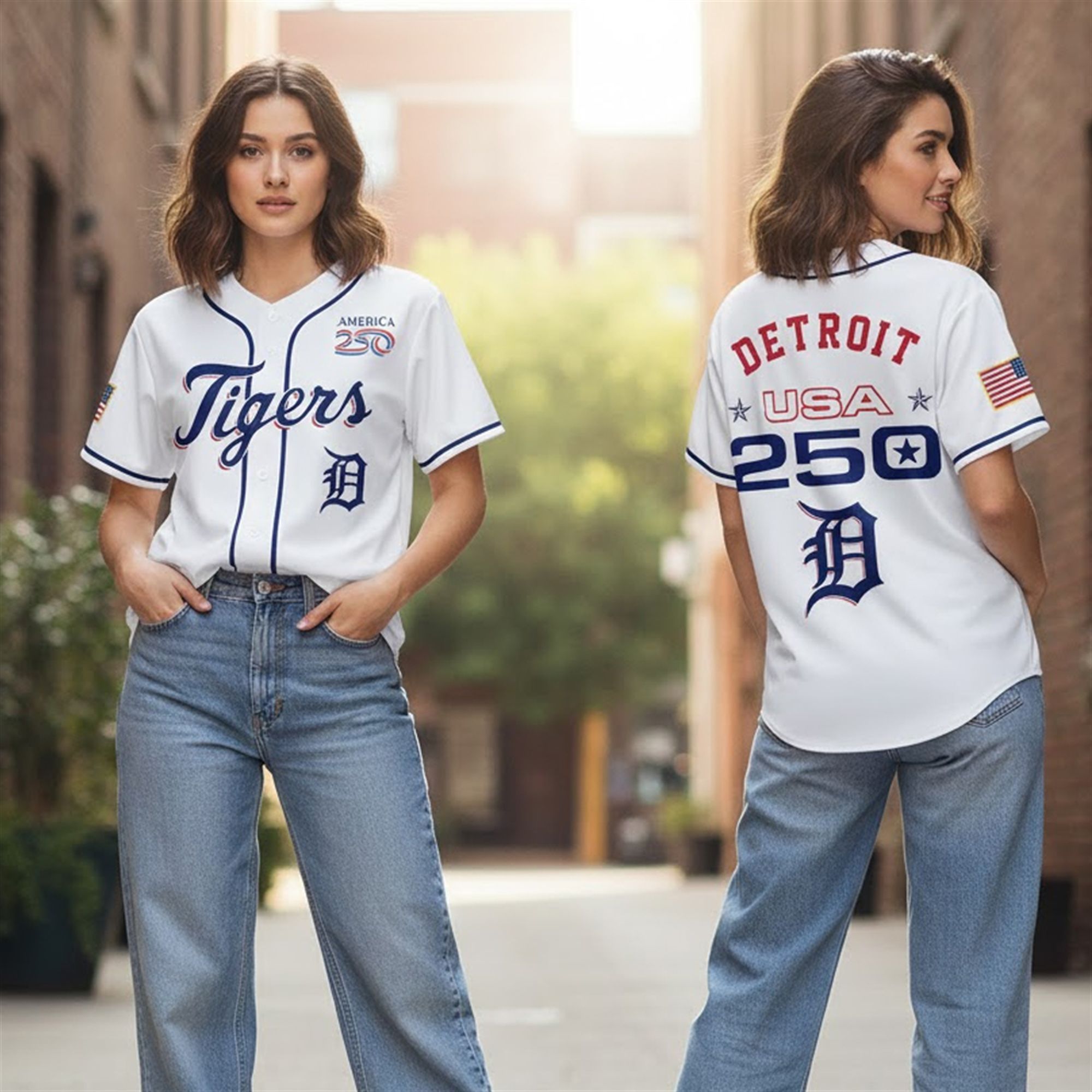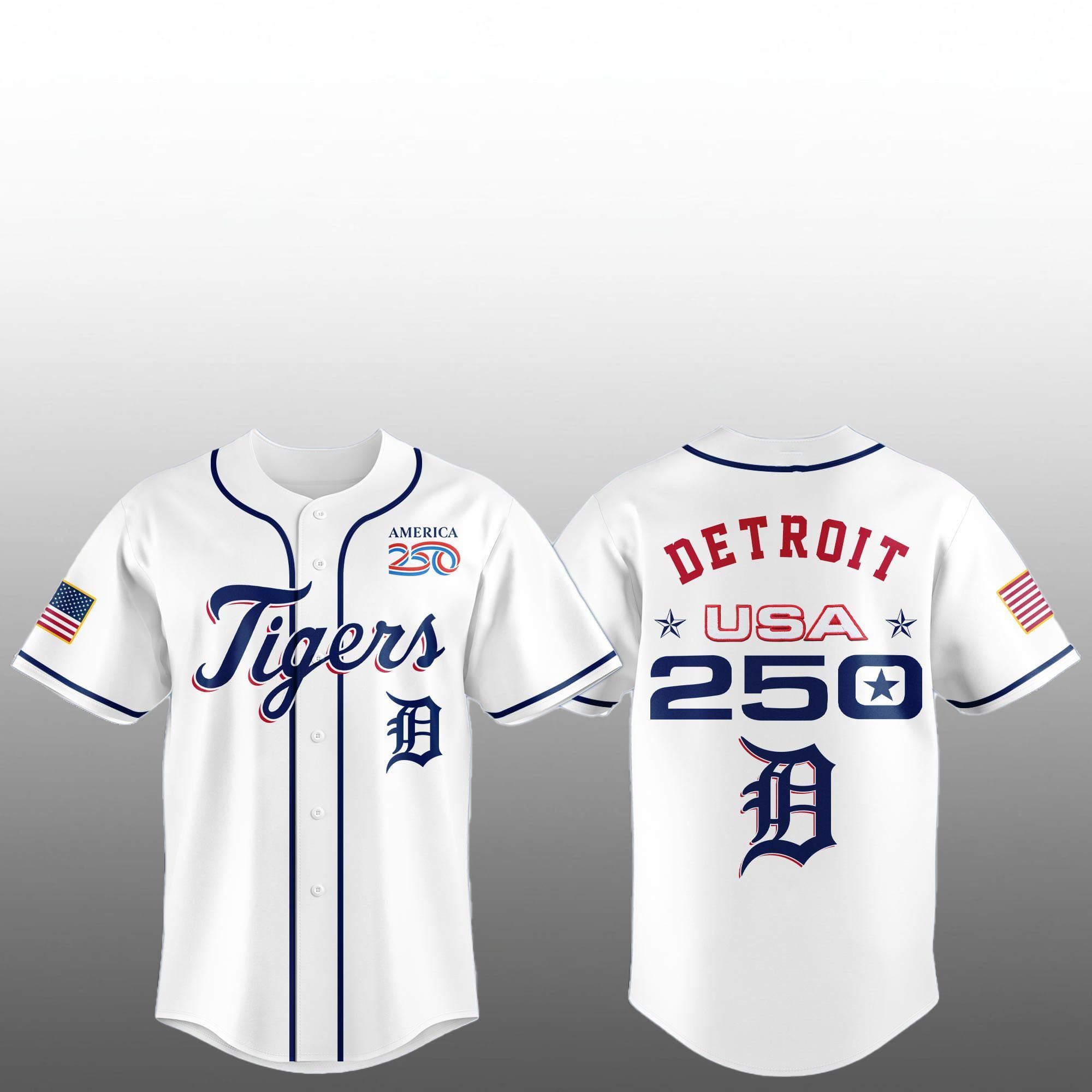 The 2026 Detroit Tigers America 250 collection is more than just fan gear; it is a wearable archive of the American spirit. The design features a crisp, white base—symbolizing a fresh chapter in the nation’s history—accentuated by deep navy and vibrant red trim that mirrors the colors of the Star-Spangled Banner. The front of the jersey proudly displays the iconic “Tigers” script, while the back features a bold “DETROIT 250” graphic, anchored by the USA 250 logo that is being used across all major sporting leagues this year.