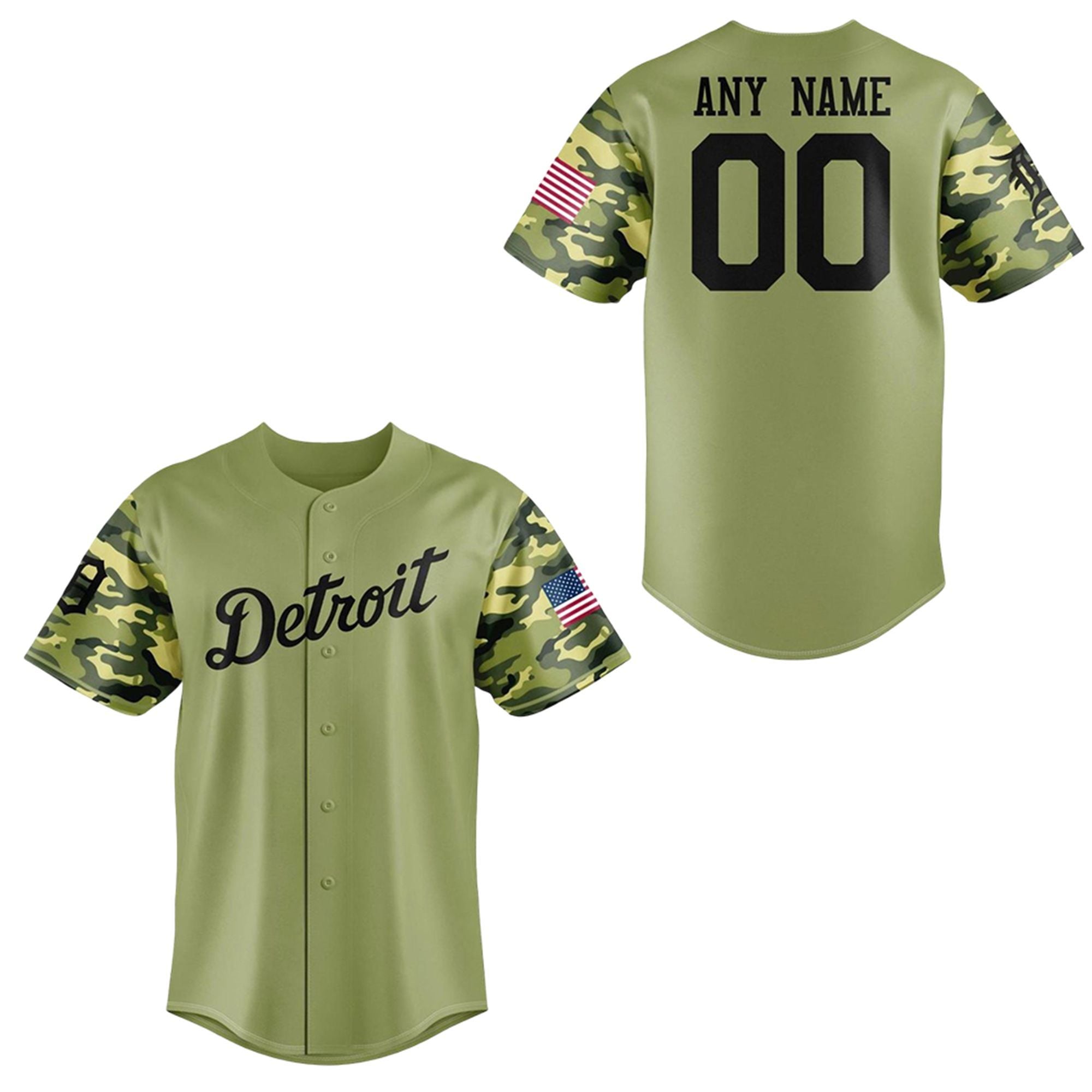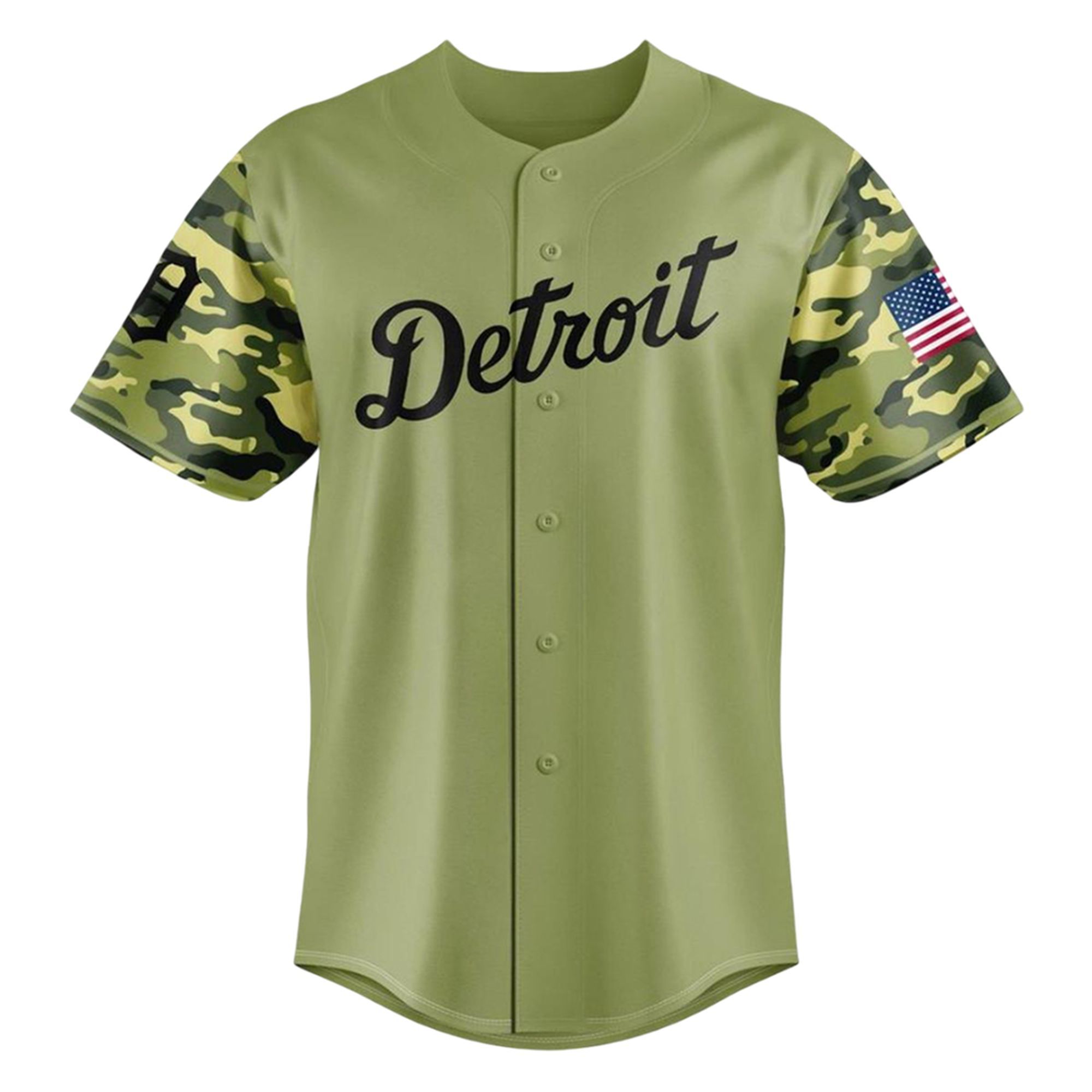 The jersey is a masterclass in sports-inspired commemorative apparel. Moving away from standard home-whites, this edition embraces a rugged yet refined olive-green body, perfectly accented by high-definition camouflage sleeves. The iconic “Detroit” script flows across the chest in a classic black cursive, maintaining the timeless Tigers aesthetic while embracing a modern tactical look.