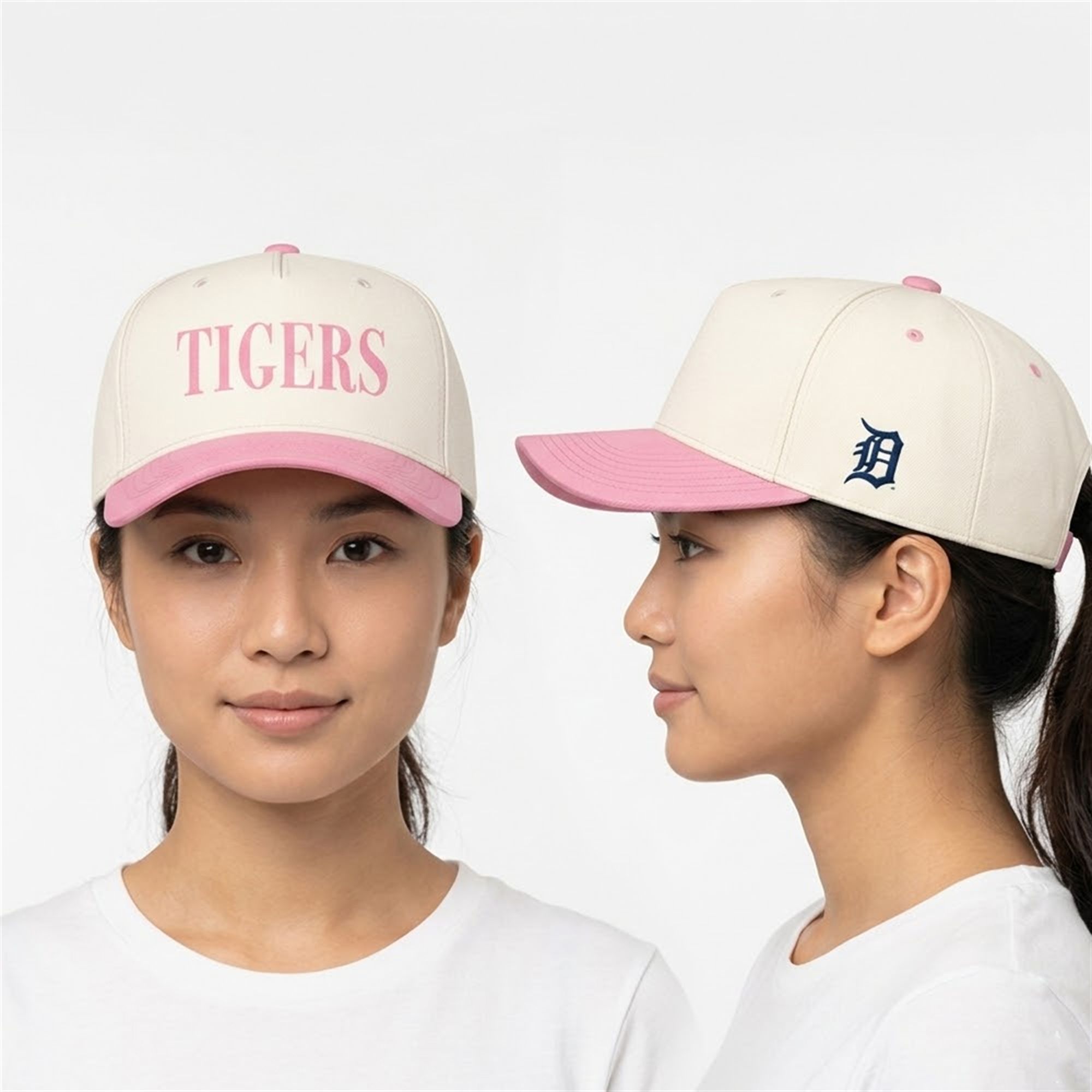 The hat offers a visually stunning departure from traditional baseball caps. The design centers around a beautiful, crisp cream crown that serves as a neutral canvas for the cap’s bolder elements. Across the front panels, the word “TIGERS” is displayed in a vibrant, eye-catching pink serif font, perfectly matching the striking pink tone of the visor and the top button. To ground the design in rich franchise history, the classic Detroit Tigers English ‘D’ logo is strategically placed on the right side panel in its traditional navy blue. This thoughtful color-blocking creates a beautiful aesthetic that honors the team while pushing the boundaries of modern sports apparel.