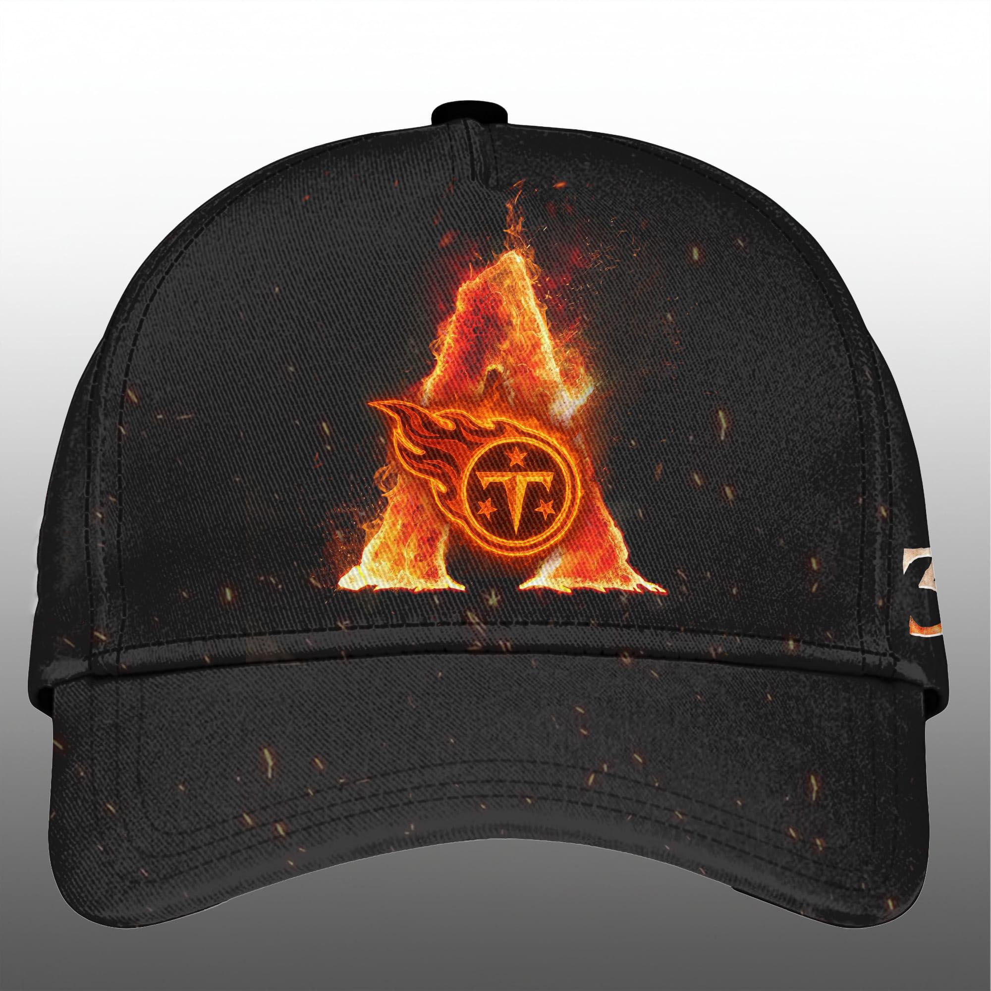 Front Graphic: Features the bold “TITANS” wordmark and the iconic Flaming Thumbtack logo, rendered with hyper-realistic ember and ash particle effects that look like they are glowing off the fabric.