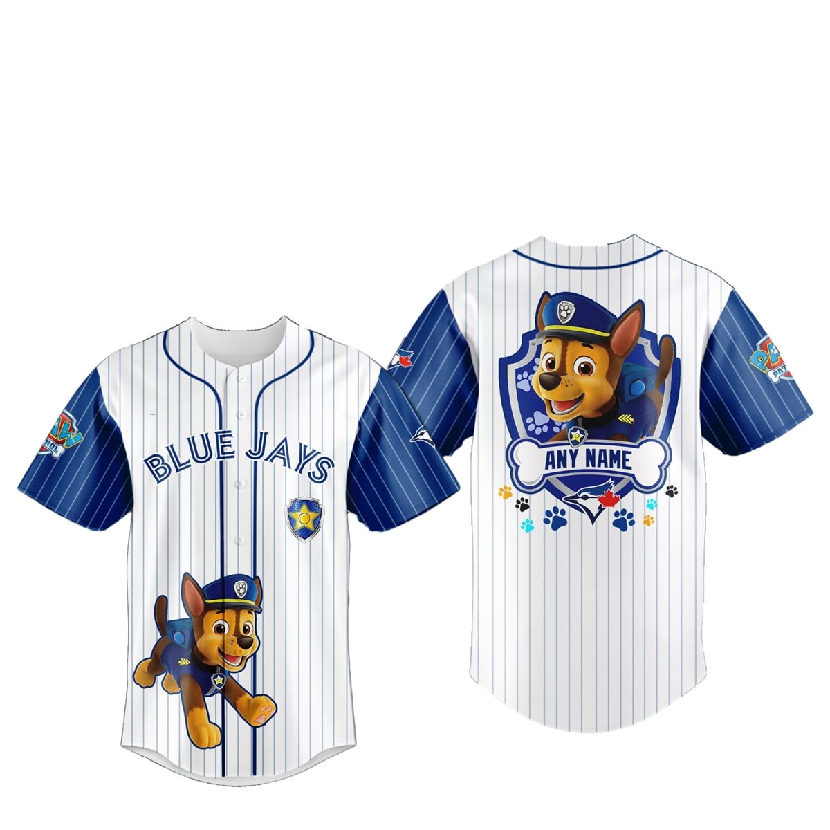 This jersey of fan apparel brilliantly captures the essence of classic baseball aesthetics while injecting the playful energy of a beloved animated series. The design features a crisp white base heavily accented with traditional navy blue vertical pinstripes. The short sleeves are presented in a bold, solid blue color block, detailed with the Paw Patrol logo and the iconic Blue Jays bird emblem. Across the chest, the signature “BLUE JAYS” lettering arches proudly above a dynamic graphic of the character Chase mid-stride, accompanied by a special sheriff-style star badge.