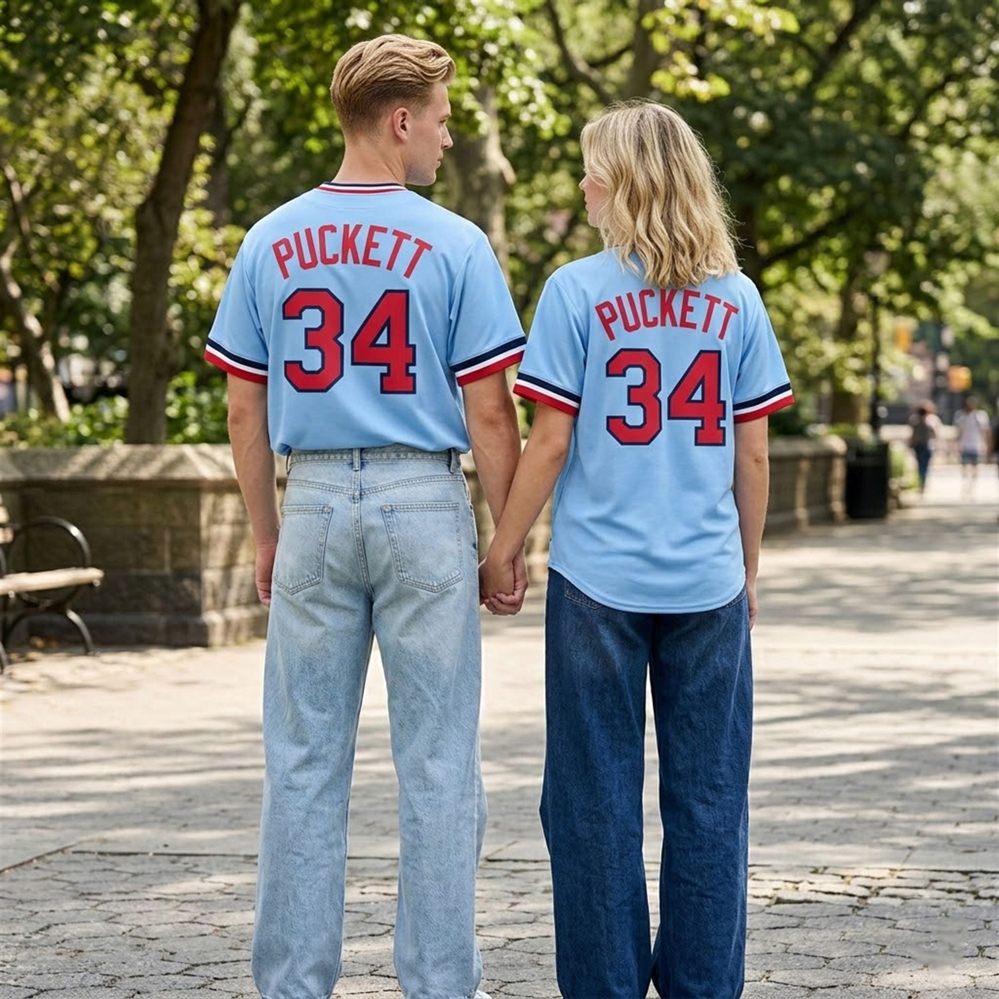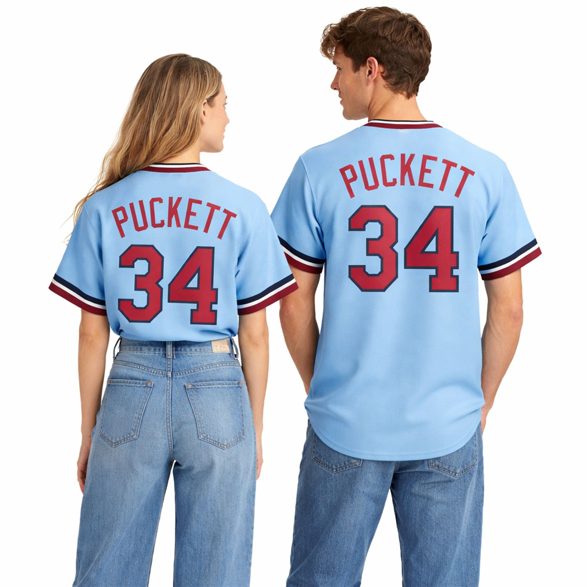 The jersey represents a brilliant intersection of modern fan enthusiasm and cherished baseball nostalgia. Visually, the piece is a stunning homage to the beloved road uniforms of the past. It features a brilliant powder-blue foundation that immediately commands attention in a sea of modern navy and white. Bold, block-style red lettering spells out “PUCKETT” across the shoulders, resting just above the legendary, oversized number “34.”