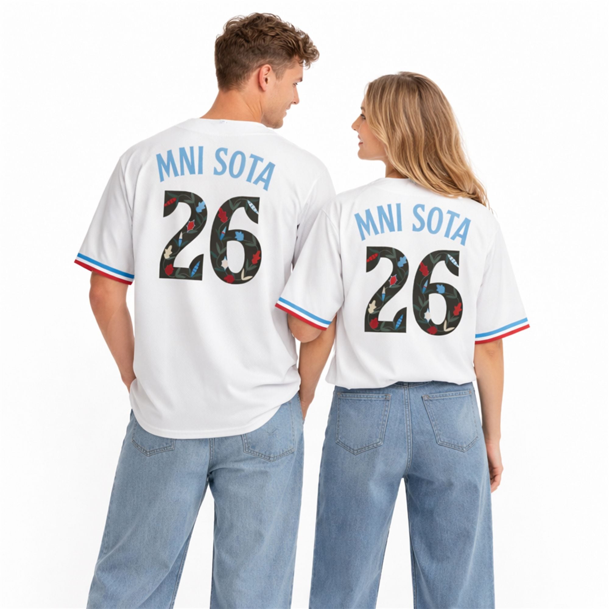 Beneath the historic lettering sits the bold number “26,” commemorating the specific season of the event. However, it is the interior of the numbers that truly defines this piece. The digits are filled with an intricate, vibrant woodland floral pattern—an artistic style deeply tied to the Ojibwe and Dakota traditions of the region. Rich reds, vivid blues, bright whites, and natural greens intertwine in delicate leaf and petal motifs, creating a stunning contrast against the dark background of the numbers. Red, white, and blue striping on the sleeves provides a classic baseball finish, framing the intricate cultural artwork perfectly.