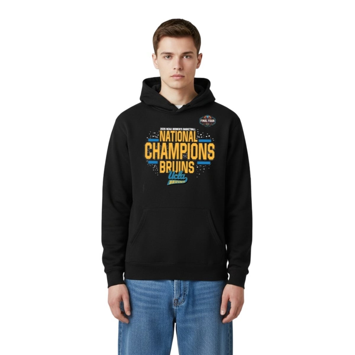 The shirt is more than just a piece of fan apparel; it is a wearable trophy celebrating one of the most remarkable seasons in collegiate sports history. Featuring bold, eye-catching graphics that proudly declare the Bruins as the undisputed National Champions, this design incorporates the iconic Final Four logo alongside classic, stylized UCLA lettering. The striking yellow and blue typography pops brilliantly against the dark background, ensuring that your allegiance is visible from across the arena. This item serves as a physical timestamp of the 2026 tournament, capturing the adrenaline, the buzzer-beaters, and the sheer dominance of the UCLA women’s basketball program.
