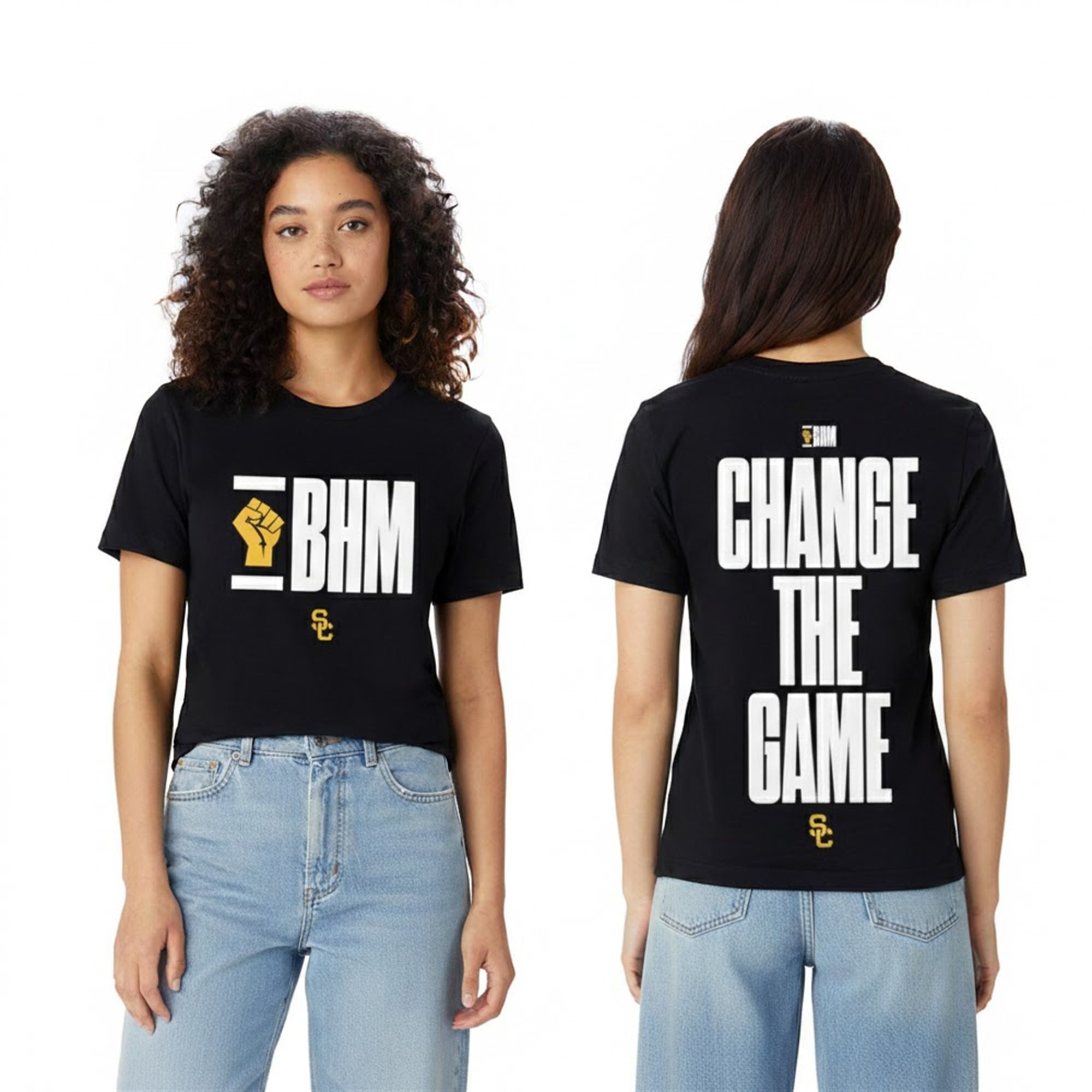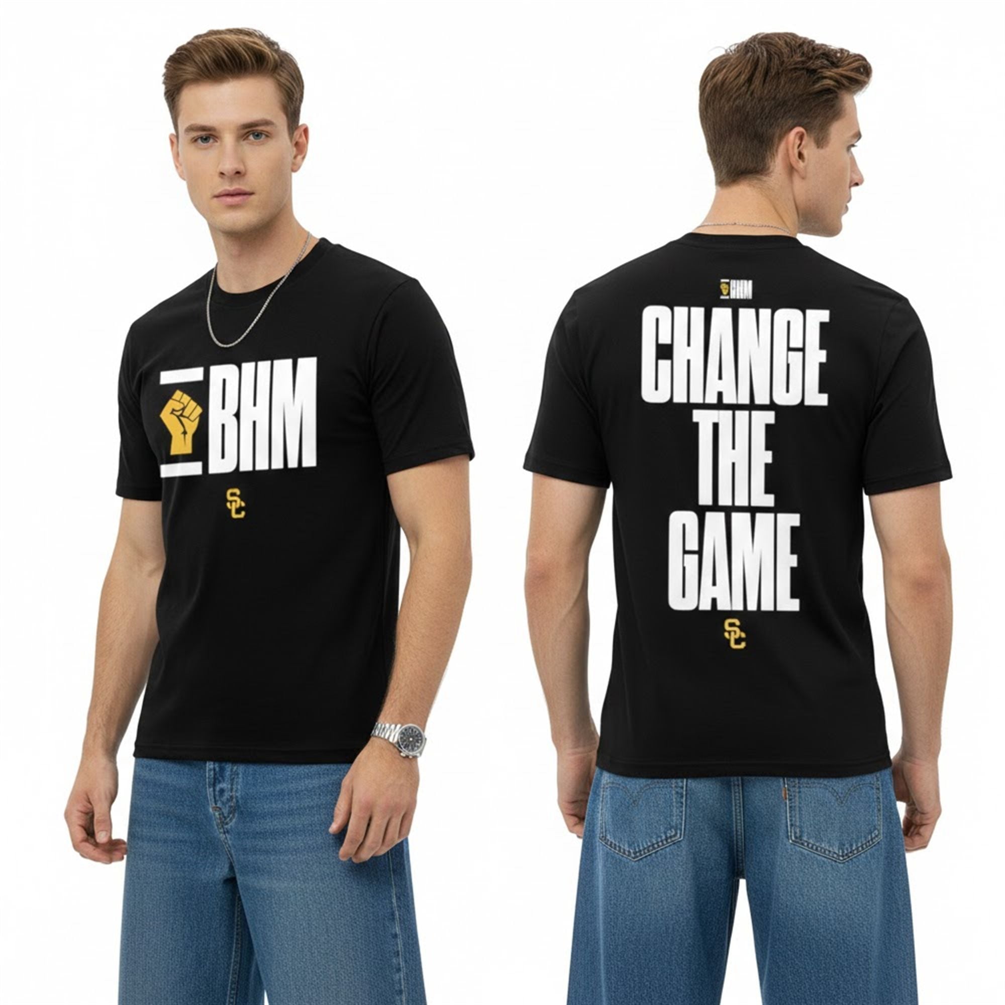 The Front: The chest features a modernized “BHM” acronym block, flanked by a stylized bracket graphic. Inside the “B” block, the raised fist icon—a timeless symbol of solidarity, strength, and resistance—is rendered in the signature USC Gold. This pop of color against the stark white text and black background creates an immediate focal point, grounding the design in Trojan identity while elevating the universal message of Black History Month.