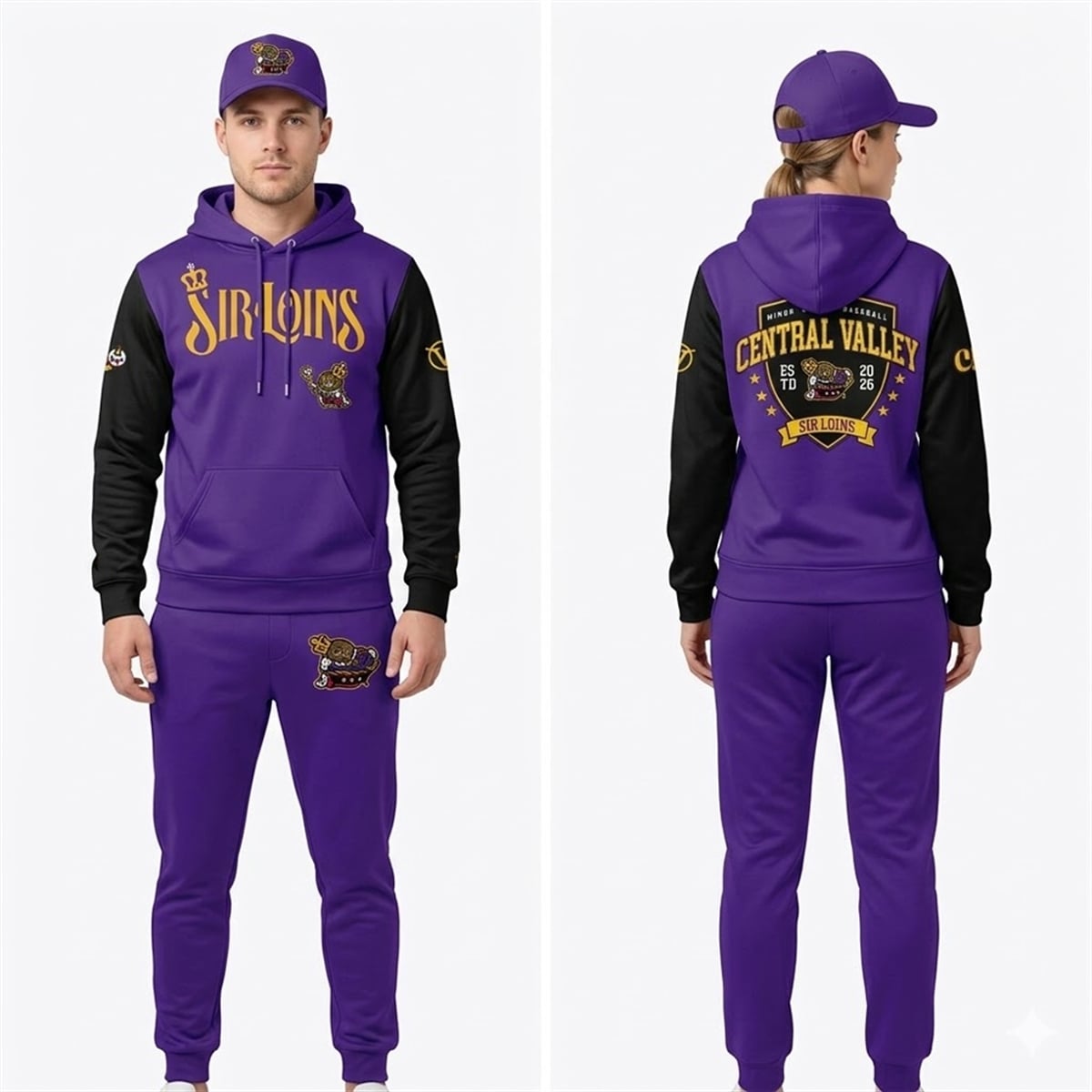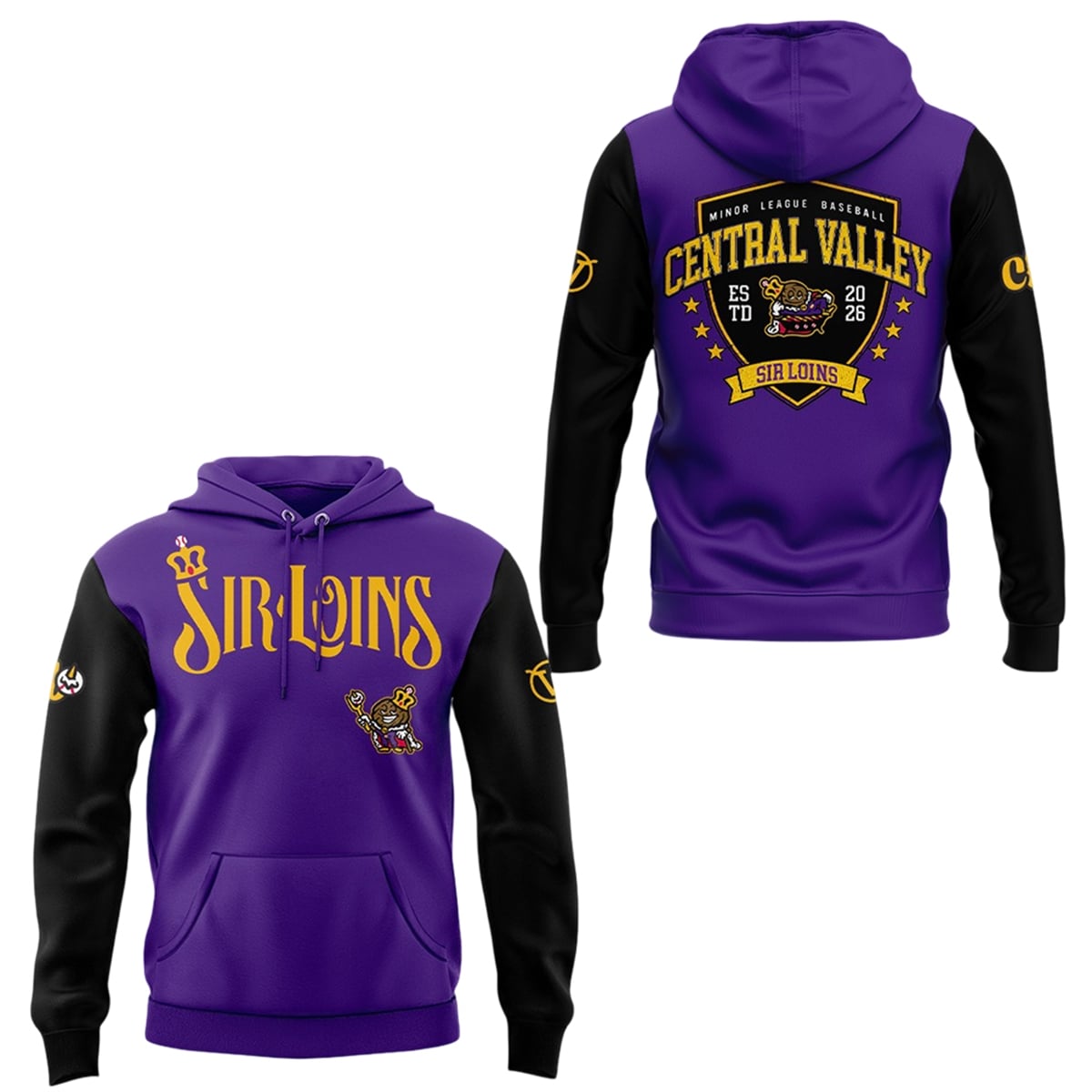 Step into the 2026 baseball season with the 2026 Visalia Rawhide Central Valley Sir Loins Hoodie. Designed to celebrate the Visalia Rawhide’s highly publicized “Sir Loins” rebranding, this striking purple and black apparel allows fans to showcase their team pride and embrace one of the most unique promotional events in minor league sports history.