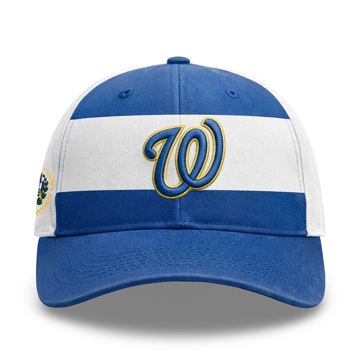 The hat presents a visually captivating design that seamlessly blends sports fandom with national pride. The cap’s color palette is directly inspired by the flag of El Salvador, featuring bold horizontal bands of vivid blue and crisp white. Centered on the front panels is the classic, curly “W” logo of the Washington Nationals, outlined in a striking gold tone that makes the emblem pop against the white background.