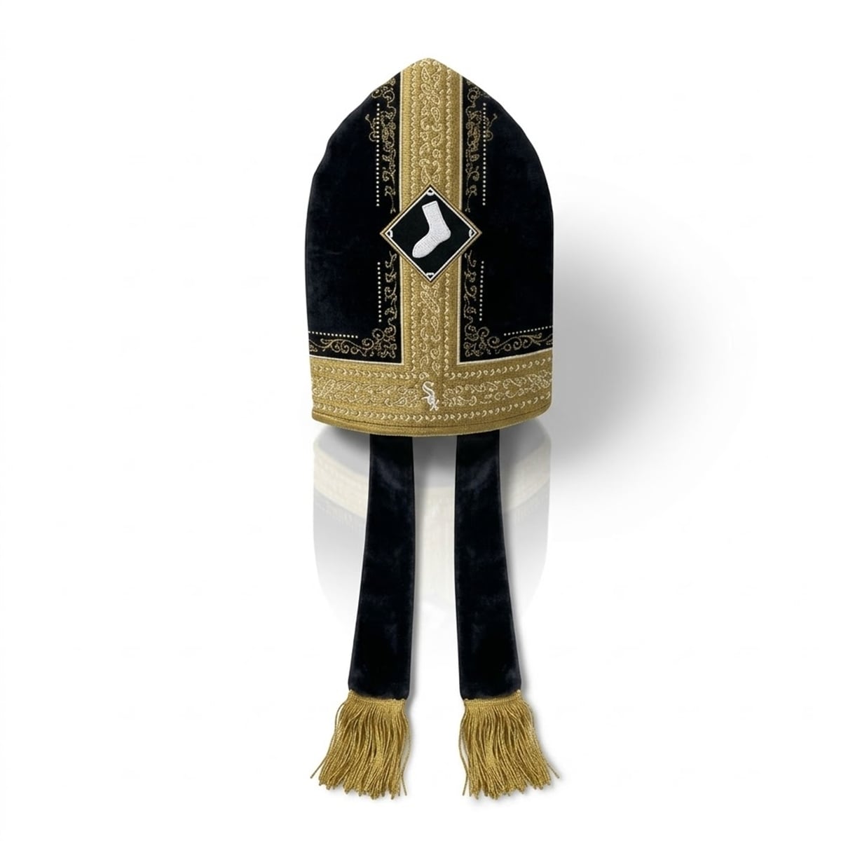 The hat is a groundbreaking piece of sports promotion merchandise that reimagines traditional headwear for the modern stadium experience. Designed in the classic shape of a traditional papal mitre, the hat features a striking deep black visual base offset by elaborate, ornate gold-toned graphic patterns that run vertically and horizontally across the surface. At the very center of the cross-pattern sits the classic, universally recognized White Sox logo—a single white sock encased in a sleek diamond frame.