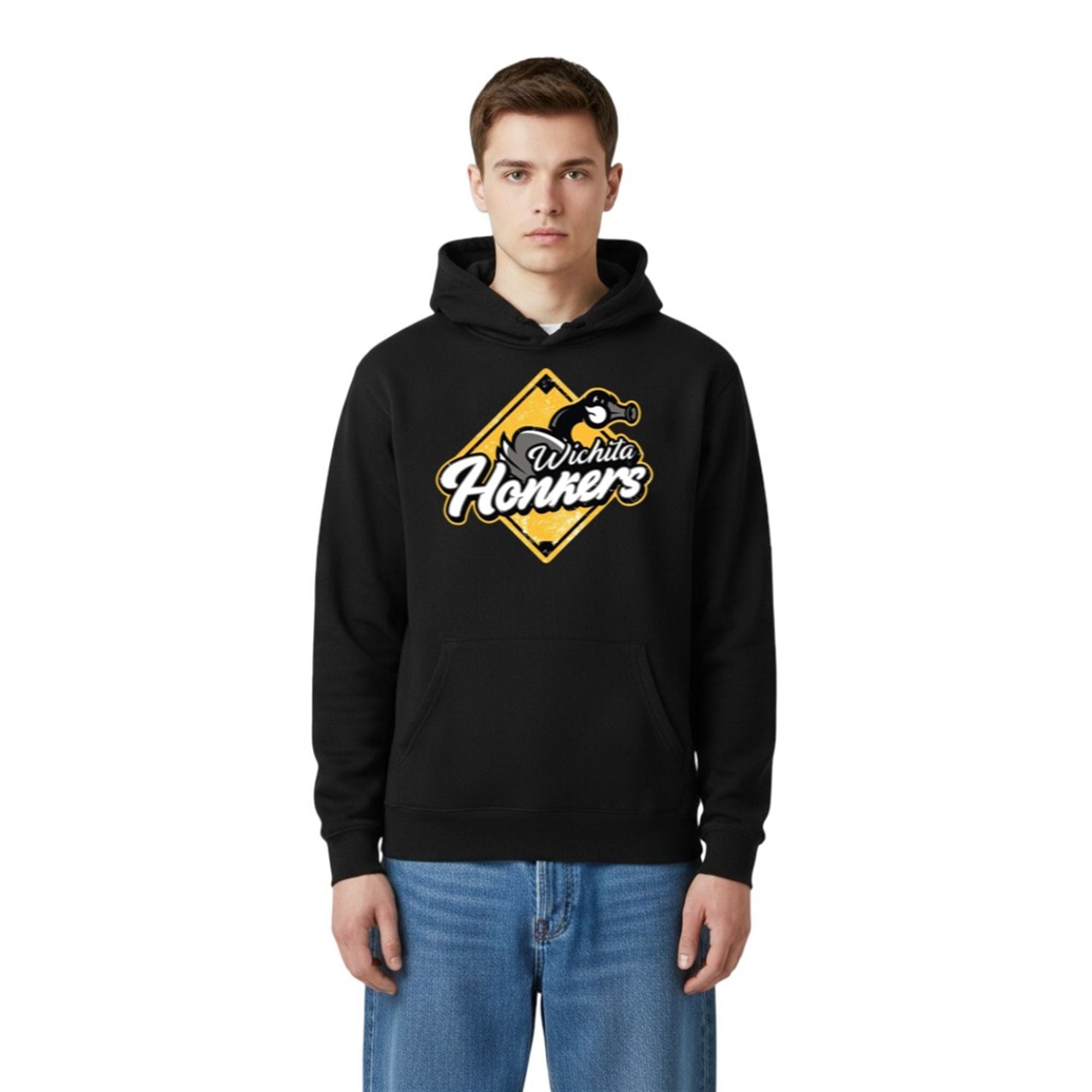 The typography is equally crucial to the look. The word “Wichita” is rendered in a fluid, classic script, contrasting sharply with the bold, thick-bordered lettering of “Honkers.” This juxtaposition of elegant script and heavy block text creates a dynamic visual hierarchy that draws the eye immediately to the center of the chest. The stark black canvas of the shirt serves as the perfect negative space, making the yellow and white logo pop with incredible vibrancy.
