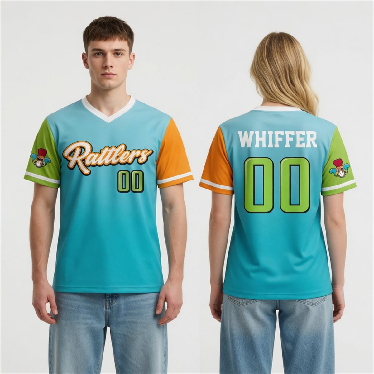 What truly sets this promotional gear apart is its asymmetrical, hyper-vibrant sleeve design. The right sleeve bursts with a neon-inspired lime green, while the left sleeve boasts a rich, energetic tangerine orange. Both sleeves are adorned with custom mascot logo graphics, adding an extra layer of visual storytelling. Turning to the back, the jersey proudly displays the nameplate “WHIFFER” above the traditional mascot number “00,” rendered in the same neon green with bold, contrasting borders. This piece is not just apparel; it is a canvas celebrating the joy of the game.