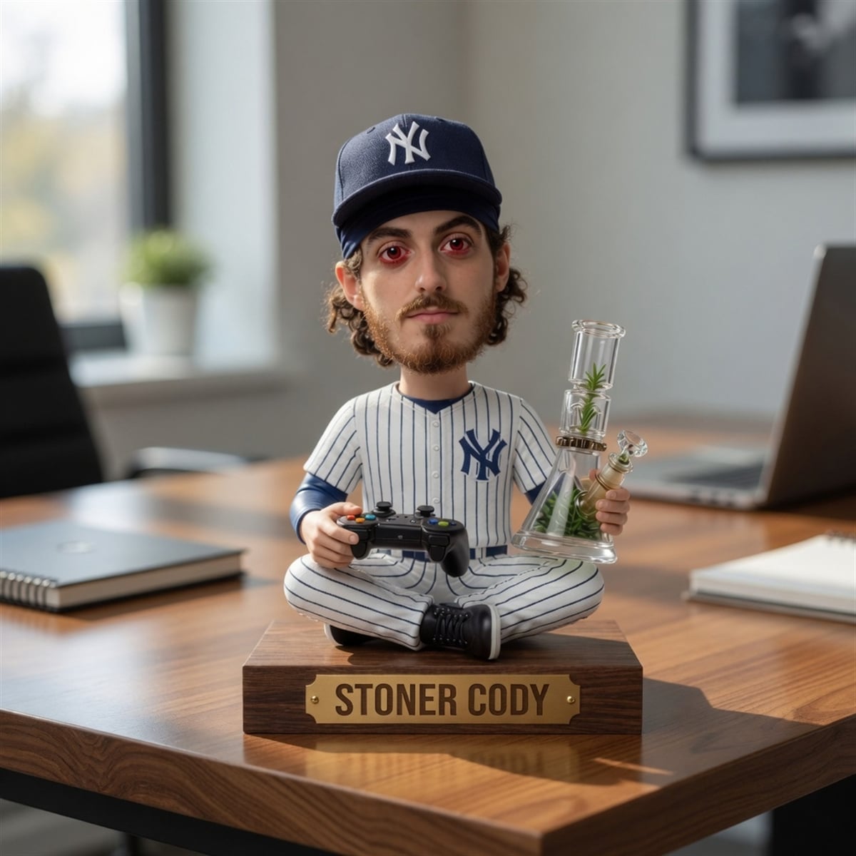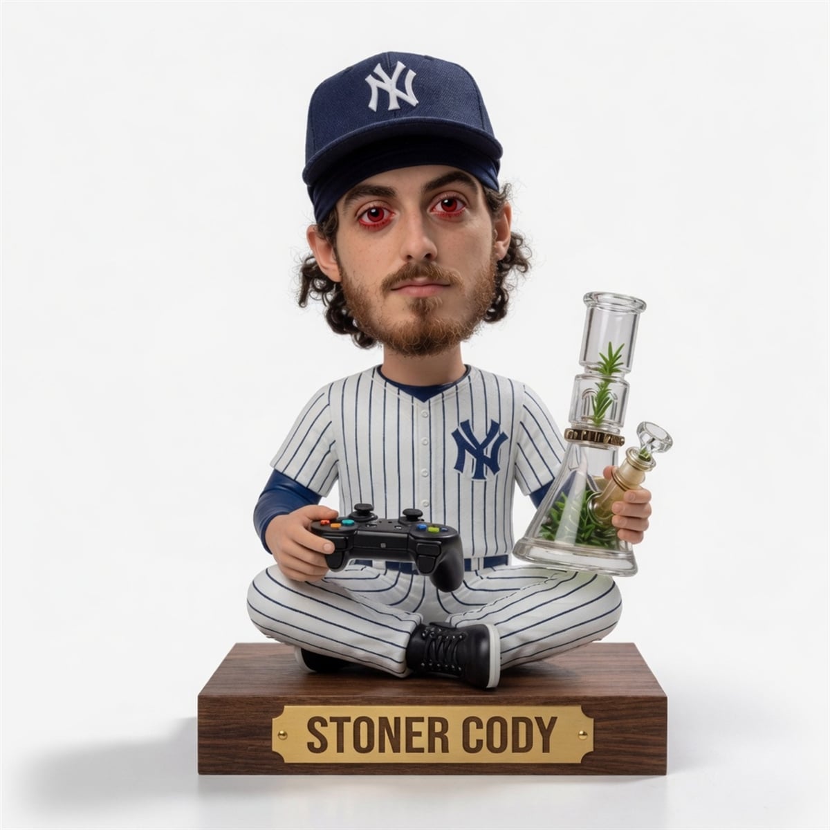 The traditional sports collectible landscape has been completely disrupted by the arrival of the bobblehead. Featuring the iconic Yankees pinstripes, this piece depicts the star player sitting cross-legged in a state of absolute Zen. Equipped with a gaming controller in one hand and a remarkably detailed water pipe in the other, the figure is complete with a hilariously exaggerated, red-eyed facial expression. Mounted on a classic base featuring a brass-toned plaque that proudly reads “STONER CODY,” this item bridges the gap between digital humor and physical reality.