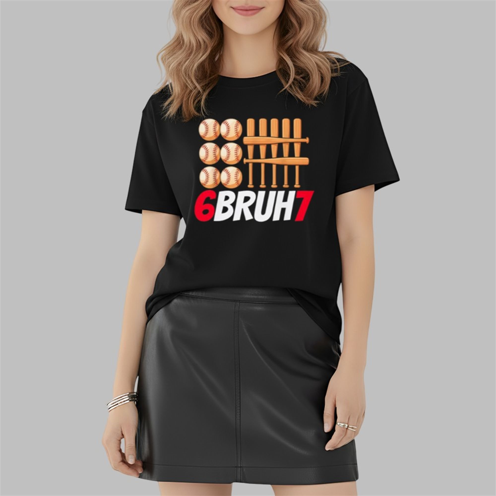 Designed for the player who has seen it all—from bad hops to questionable strike zones—this shirt features a striking graphic. On the left, six detailed baseballs act as the “stars,” while on the right, seven wooden bats create the “stripes,” offering a sporty nod to Americana aesthetics. Anchoring the design is the text “6 BRUH 7” in bold white and vibrant red, popping sharply against the premium black fabric.