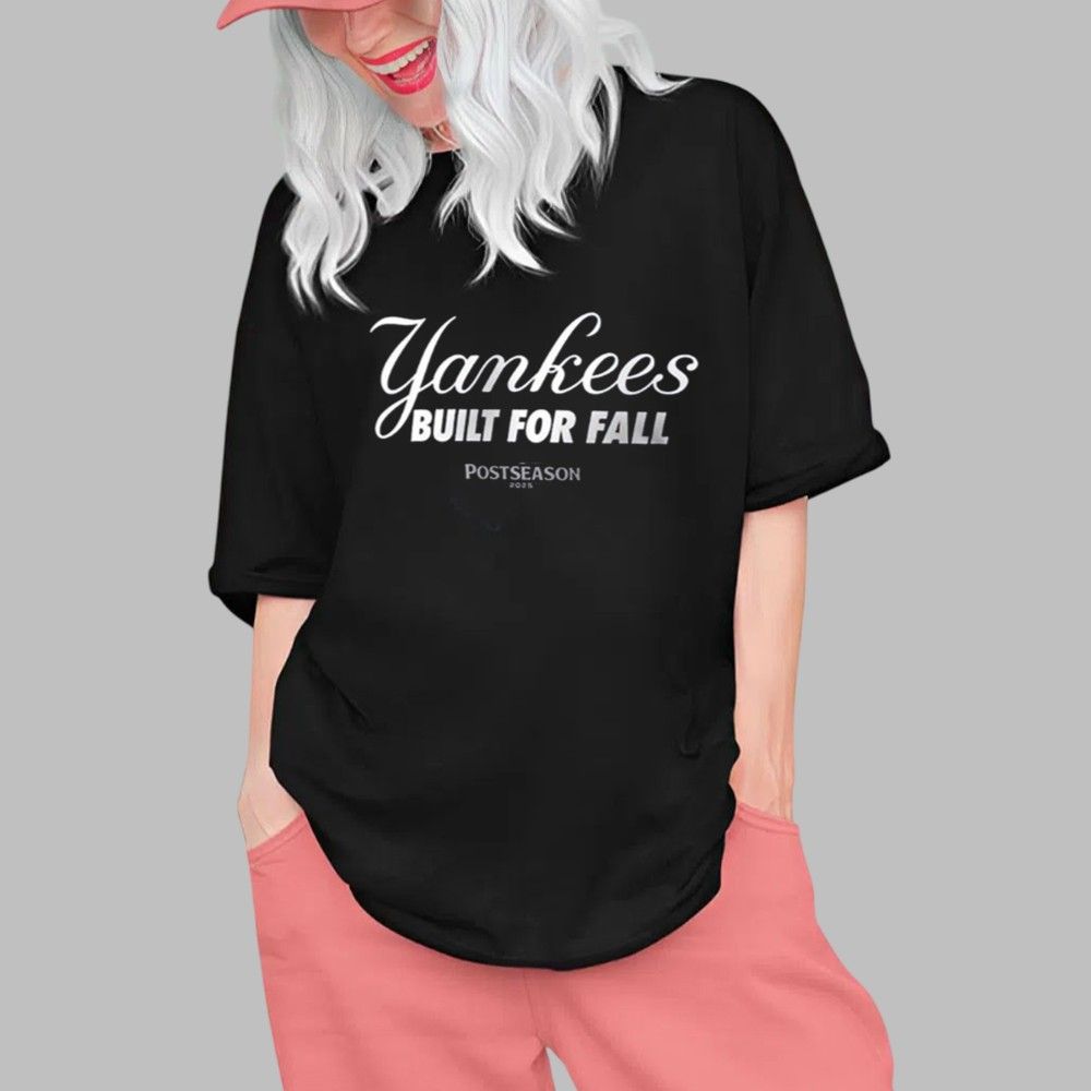This 2025 edition shirt features a clean, powerful design on a classic black base, ensuring it stands out in the stands or on the street. The iconic “Yankees” script is elegantly displayed in white, immediately recognizable and filled with history. Directly beneath it, the bold statement “BUILT FOR FALL” serves as the team’s mantra for their October campaign. The design is completed with “POSTSEASON 2025,” officially marking this gear as a commemorative piece for this year’s thrilling championship run. Wear the same style as Aaron Judge and show the world that you believe in the Bronx Bombers.