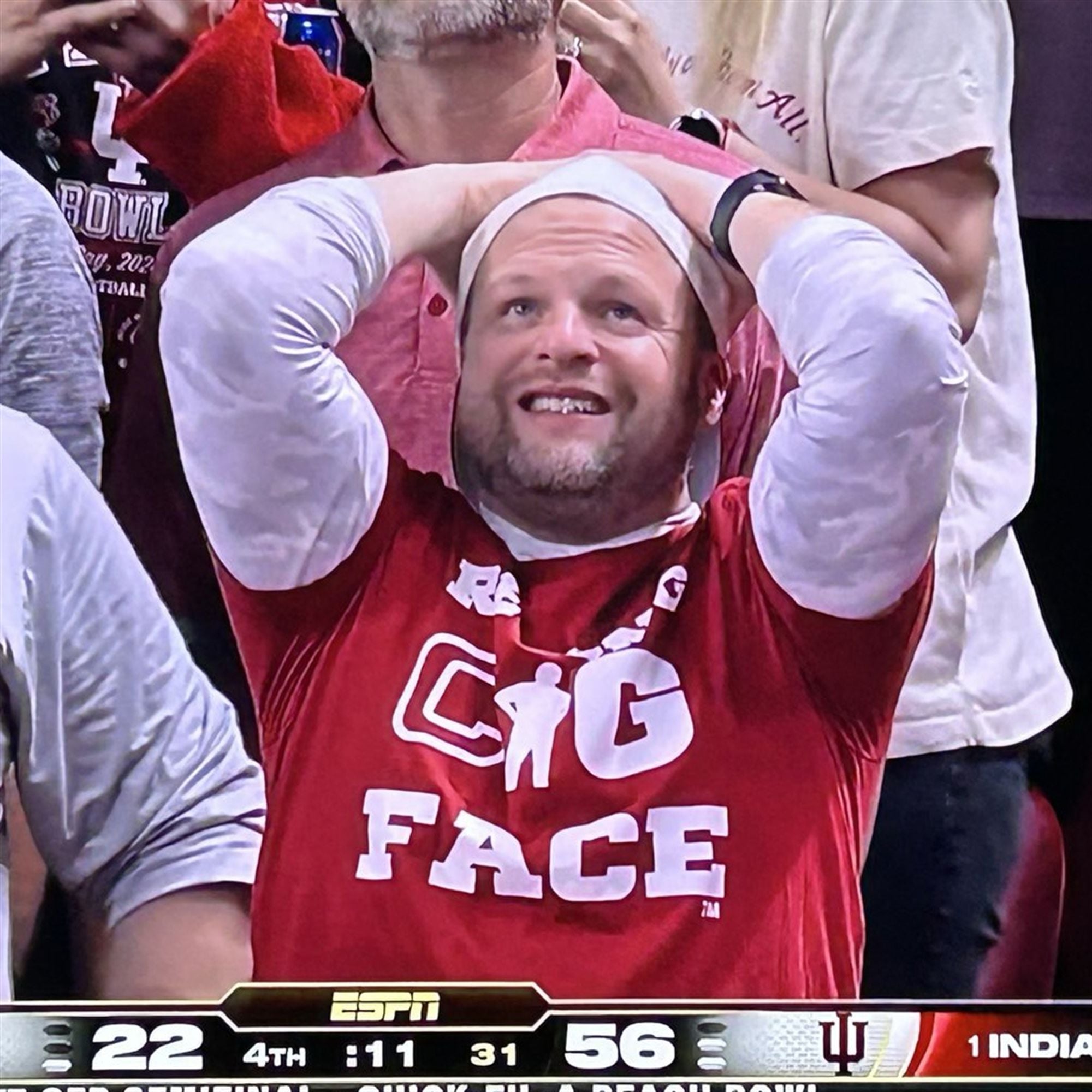 The shirt exploded in popularity due to the perfect storm of on-field success and off-field personality. As Curt Cignetti led Indiana to unprecedented victories, his refusal to smile or celebrate—maintaining a stoic “resting face”—became a beloved meme among fans used to heartbreak. The viral moment peaked when WDRB sports director Aaron Matas, a prominent figure in Louisville/Indiana sports media, was spotted wearing the shirt. His endorsement legitimized the meme, transforming it from an internet joke into a physical symbol of the Hoosiers’ gritty, business-like domination.